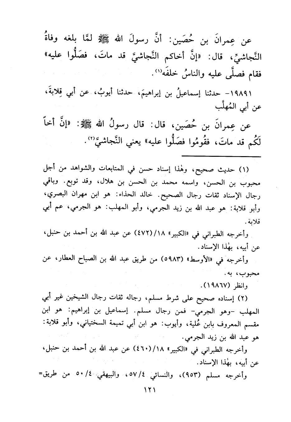 عَنْ عِمْرَانَ بْنِ حُصَيْنٍ، أَنَّ رَسُولَ اللهِ صَلَّى اللهُ عَلَيْهِ وَسَلَّمَ لَمَّا بَلَغَهُ وَفَاةُ النَّجَاشِيِّ قَالَ: " إِنَّ أَخَاكُمْ النَّجَاشِيَّ قَدْ مَاتَ فَصَلُّوا عَلَيْهِ " فَقَامَ فَصَلَّى عَلَيْهِ وَالنَّاسُ خَلْفَهُ (١)