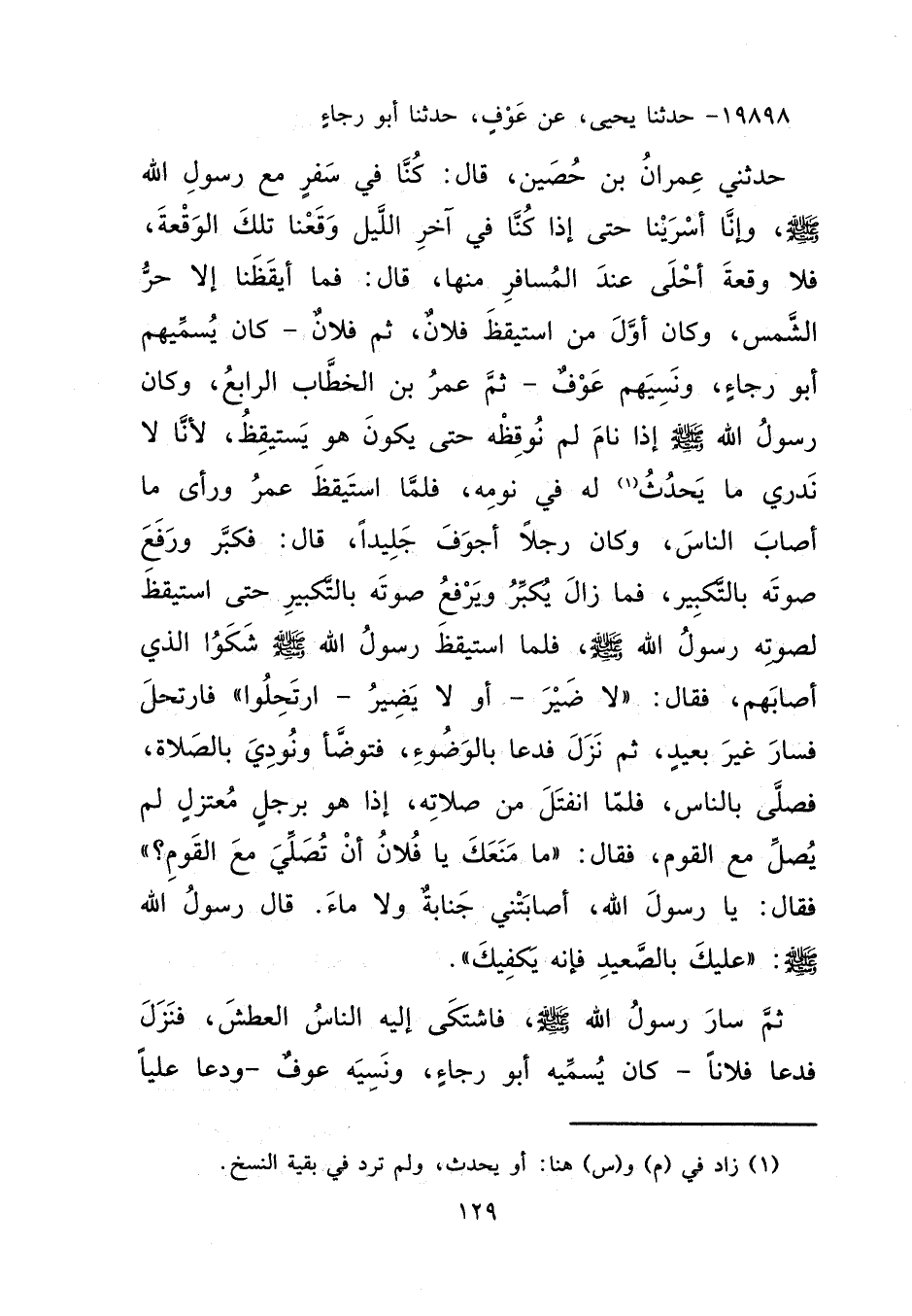 ١٩٨٩٨ - حَدَّثَنَا يَحْيَى، عَنْ عَوْفٍ، حَدَّثَنَا أَبُو رَجَاءٍ، حَدَّثَنِي عِمَرانُ بْنُ حُصَيْنٍ قَالَ: كُنَّا فِي سَفَرٍ مَعَ رَسُولِ اللهِ صَلَّى اللهُ عَلَيْهِ وَسَلَّمَ وَإِنَّا أَسْرَيْنَا حَتَّى إِذَا كُنَّا فِي آخِرِ اللَّيْلِ وَقَعْنَا تِلْكَ الْوَقْعَةَ، فَلَا وَقْعَةَ أَحْلَى عِنْدَ الْمُسَافِرِ مِنْهَا. قَالَ: فَمَا أَيْقَظَنَا إِلَّا حَرُّ الشَّمْسِ، وَكَانَ أَوَّلَ مَنْ اسْتَيْقَظَ فُلَانٌ، ثُمَّ فُلَانٌ، كَانَ يُسَمِّيهِمْ أَبُو رَجَاءٍ وَنَسِيَهُمْ عَوْفٌ، ثُمَّ عُمَرُ بْنُ الْخَطَّابِ الرَّابِعُ، وَكَانَ رَسُولُ اللهِ صَلَّى اللهُ عَلَيْهِ وَسَلَّمَ إِذَا نَامَ لَمْ نُوقِظْهُ حَتَّى يَكُونَ هُوَ يَسْتَيْقِظُ؛ لِأَنَّا لَا نَدْرِي مَا يَحْدُثُ (١) لَهُ فِي نَوْمِهِ، فَلَمَّا اسْتَيْقَظَ عُمَرُ، وَرَأَى مَا أَصَابَ النَّاسَ، وَكَانَ رَجُلًا أَجْوَفَ جَلِيدًا قَالَ: فَكَبَّرَ وَرَفَعَ صَوْتَهُ بِالتَّكْبِيرِ، فَمَا زَالَ يُكَبِّرُ وَيَرْفَعُ صَوْتَهُ بِالتَّكْبِيرِ حَتَّى اسْتَيْقَظَ لِصَوْتِهِ رَسُولُ اللهِ صَلَّى اللهُ عَلَيْهِ وَسَلَّمَ، فَلَمَّا اسْتَيْقَظَ رَسُولُ اللهِ صَلَّى اللهُ عَلَيْهِ وَسَلَّمَ شَكَوْا الَّذِي أَصَابَهُمْ. فَقَالَ: " لَا ضَيْرَ أَوْ لَا يَضِيرُ ارْتَحِلُوا ". فَارْتَحَلَ فَسَارَ غَيْرَ بَعِيدٍ، ثُمَّ نَزَلَ فَدَعَا بِالْوَضُوءِ فَتَوَضَّأَ، وَنُودِيَ بِالصَّلَاةِ فَصَلَّى بِالنَّاسِ، فَلَمَّا انْفَتَلَ مِنْ صَلَاتِهِ إِذَا هُوَ بِرَجُلٍ مُعْتَزِلٍ لَمْ يُصَلِّ مَعَ الْقَوْمِ فَقَالَ: " مَا مَنَعَكَ يَا فُلَانُ أَنْ تُصَلِّيَ مَعَ الْقَوْمِ؟ " فَقَالَ: يَا رَسُولَ اللهِ أَصَابَتْنِي جَنَابَةٌ وَلَا مَاءَ. قَالَ رَسُولُ اللهِ صَلَّى اللهُ عَلَيْهِ وَسَلَّمَ: " عَلَيْكَ بِالصَّعِيدِ؛ فَإِنَّهُ يَكْفِيكَ ". ثُمَّ سَارَ رَسُولُ اللهِ صَلَّى اللهُ عَلَيْهِ وَسَلَّمَ فَاشْتَكَى إِلَيْهِ النَّاسُ الْعَطَشَ، فَنَزَلَ فَدَعَا فُلَانًا، كَانَ يُسَمِّيهِ أَبُو رَجَاءٍ، وَنَسِيَهُ عَوْفٌ، وَدَعَا عَلِيًّا