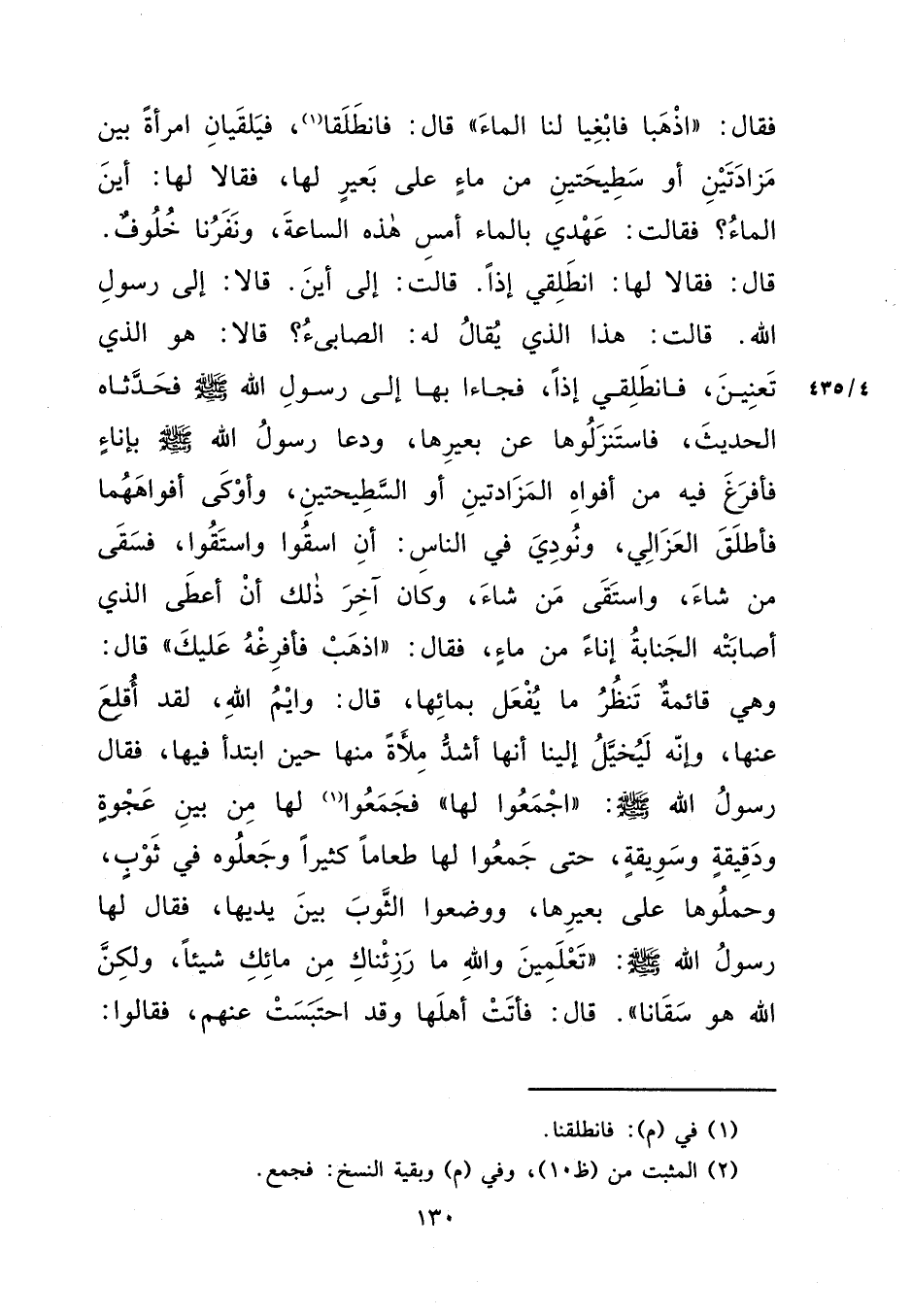 فَقَالَ: اذْهَبَا فَابْغِيَا لَنَا الْمَاءَ. قَالَ: فَانْطَلَقَا (١) فَيَلْقَيَانِ امْرَأَةً بَيْنَ مَزَادَتَيْنِ أَوْ سَطِيحَتَيْنِ مِنْ مَاءٍ عَلَى بَعِيرٍ لَهَا فَقَالَا لَهَا: أَيْنَ الْمَاءُ؟ فَقَالَتْ: عَهْدِي بِالْمَاءِ أَمْسِ هَذِهِ السَّاعَةَ، وَنَفَرُنَا خُلُوفٌ. قَالَ: فَقَالَا لَهَا: انْطَلِقِي. إِذًا قَالَتْ: إِلَى أَيْنَ؟ قَالَا: إِلَى رَسُولِ اللهِ. قَالَتْ: هَذَا الَّذِي يُقَالُ لَهُ الصَّابِئُ؟ قَالَا: هُوَ الَّذِي تَعْنِينَ. فَانْطَلِقِي إِذًا فَجَاءَا بِهَا إِلَى رَسُولِ اللهِ صَلَّى اللهُ عَلَيْهِ وَسَلَّمَ فَحَدَّثَاهُ الْحَدِيثَ، فَاسْتَنْزَلُوهَا عَنْ بَعِيرِهَا، وَدَعَا رَسُولُ اللهِ صَلَّى اللهُ عَلَيْهِ وَسَلَّمَ بِإِنَاءٍ، فَأَفْرَغَ فِيهِ مِنْ أَفْوَاهِ الْمَزَادَتَيْنِ أَوِ السَّطِيحَتَيْنِ، وَأَوْكَى أَفْوَاهَهُمَا، فَأَطْلَقَ الْعَزَالِي وَنُودِيَ فِي النَّاسِ: أَنْ اسْقُوا وَاسْتَقُوا، فَسَقَى مَنْ شَاءَ وَاسْتَقَى مَنْ شَاءَ، وَكَانَ آخِرُ ذَلِكَ أَنْ أَعْطَى الَّذِي أَصَابَتْهُ الْجَنَابَةُ إِنَاءً مِنْ مَاءٍ، فَقَالَ: " اذْهَبْ فَأَفْرِغْهُ عَلَيْكَ ". قَالَ: وَهِيَ قَائِمَةٌ تَنْظُرُ مَا يُفْعَلُ بِمَائِهَا قَالَ: وَايْمُ اللهِ لَقَدْ أَقْلَعَ عَنْهَا، وَإِنَّهُ لَيُخَيَّلُ إِلَيْنَا أَنَّهَا أَشَدُّ مِلْأَةً مِنْهَا حِينَ ابْتَدَأَ فِيهَا فَقَالَ رَسُولُ اللهِ صَلَّى اللهُ عَلَيْهِ وَسَلَّمَ: " اجْمَعُوا لَهَا ". فَجَمَعُوا (٢) لَهَا مِنْ بَيْنِ عَجْوَةٍ وَدَقِيقَةٍ وَسُوَيْقَةٍ حَتَّى جَمَعُوا لَهَا طَعَامًا كَثِيرًا وَجَعَلُوهُ فِي ثَوْبٍ وَحَمَلُوهَا عَلَى بَعِيرِهَا، وَوَضَعُوا الثَّوْبَ بَيْنَ يَدَيْهَا، فَقَالَ لَهَا رَسُولُ اللهِ صَلَّى اللهُ عَلَيْهِ وَسَلَّمَ: " تَعْلَمِينَ وَاللهِ مَا رَزِئْنَاكِ مِنْ مَائِكِ شَيْئًا، وَلَكِنَّ اللهَ هُوَ سَقَانَا " قَالَ: فَأَتَتْ أَهْلَهَا وَقَدِ احْتَبَسَتْ عَنْهُمْ فَقَالُوا: