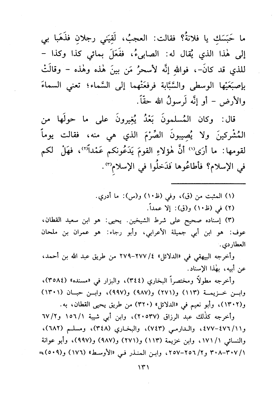 مَا حَبَسَكِ يَا فُلَانَةُ؟ فَقَالَتْ: الْعَجَبُ لَقِيَنِي رَجُلَانِ فَذَهَبَا بِي إِلَى هَذَا الَّذِي يُقَالُ لَهُ الصَّابِئُ فَفَعَلَ بِمَائِي كَذَا وَكَذَا، لِلَّذِي قَدْ كَانَ، فَوَاللهِ إِنَّهُ لَأَسْحَرُ مَنْ بَيْنَ هَذِهِ وَهَذِهِ وَقَالَتْ بِأُصْبُعَيْهَا الْوُسْطَى وَالسَّبَّابَةِ، فَرَفَعَتْهُمَا إِلَى السَّمَاءِ، تَعْنِي السَّمَاءَ وَالْأَرْضَ، أَوْ إِنَّهُ لَرَسُولُ اللهِ حَقًّا قَالَ: وَكَانَ الْمُسْلِمُونَ بَعْدُ يُغِيرُونَ عَلَى مَا حَوْلَهَا مِنَ الْمُشْرِكِينَ، وَلَا يُصِيبُونَ الصِّرْمَ الَّذِي هِيَ مِنْهُ فَقَالَتْ: يَوْمًا لِقَوْمِهَا مَا أَرَى (١) أَنَّ هَؤُلَاءِ الْقَوْمَ يَدَعُونَكُمْ عَمْدًا (٢) ؟ فَهَلْ لَكُمْ فِي الْإِسْلَامِ؟ فَأَطَاعُوهَا فَدَخَلُوا فِي الْإِسْلَامِ (٣)