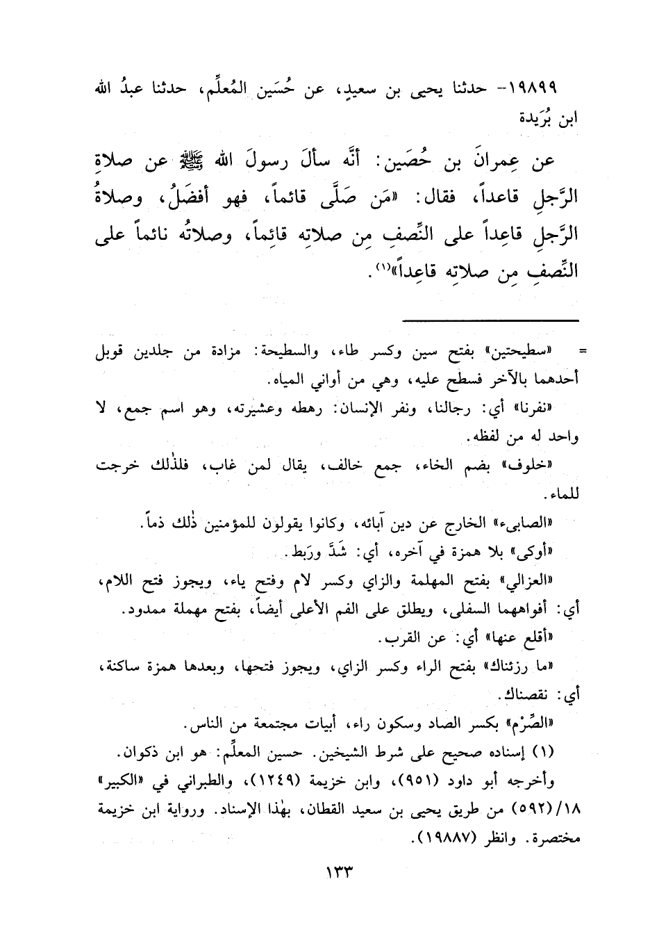 ١٩٨٩٩ - حَدَّثَنَا يَحْيَى بْنُ سَعِيدٍ، عَنْ حُسَيْنٍ الْمُعَلِّمِ، حَدَّثَنَا عَبْدُ اللهِ بْنُ بُرَيْدَةَ، عَنْ عِمْرَانَ بْنِ حُصَيْنٍ، أَنَّهُ سَأَلَ رَسُولَ اللهِ صَلَّى اللهُ عَلَيْهِ وَسَلَّمَ عَنْ صَلَاةِ الرَّجُلِ قَاعِدًا فَقَالَ: " مَنْ صَلَّى قَائِمًا فَهُوَ أَفْضَلُ، وَصَلَاةُ الرَّجُلِ قَاعِدًا عَلَى النِّصْفِ مِنْ صَلَاتِهِ قَائِمًا، وَصَلَاتُهُ نَائِمًا عَلَى النِّصْفِ مِنْ صَلَاتِهِ قَاعِدًا " (١)