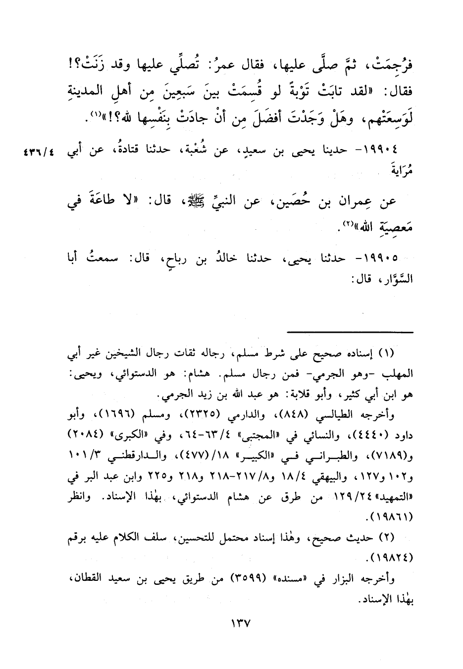 ١٩٩٠٤ - حَدَّثَنَا يَحْيَى بْنُ سَعِيدٍ، عَنْ شُعْبَةَ، حَدَّثَنَا قَتَادَةُ، عَنْ أَبِي مِرَايَةَ، عَنْ عِمْرَانَ بْنِ حُصَيْنٍ، عَنِ النَّبِيِّ صَلَّى اللهُ عَلَيْهِ وَسَلَّمَ قَالَ: " لَا طَاعَةَ فِي مَعْصِيَةِ اللهِ " (٢)