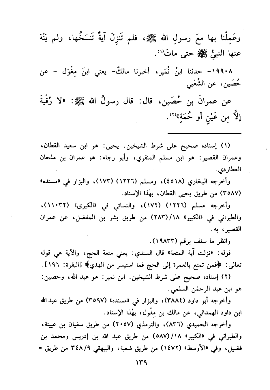 ١٩٩٠٨ - حَدَّثَنَا ابْنُ نُمَيْرٍ، أَخْبَرَنَا مَالِكٌ يَعْنِي ابْنَ مِغْوَلٍ، عَنْ حُصَيْنٍ، عَنِ الشَّعْبِيِّ، عَنْ عِمْرَانَ بْنِ حُصَيْنٍ قَالَ: قَالَ رَسُولُ اللهِ صَلَّى اللهُ عَلَيْهِ وَسَلَّمَ: " لَا رُقْيَةَ إِلَّا مِنْ عَيْنٍ أَوْ حُمَةٍ " (٢)