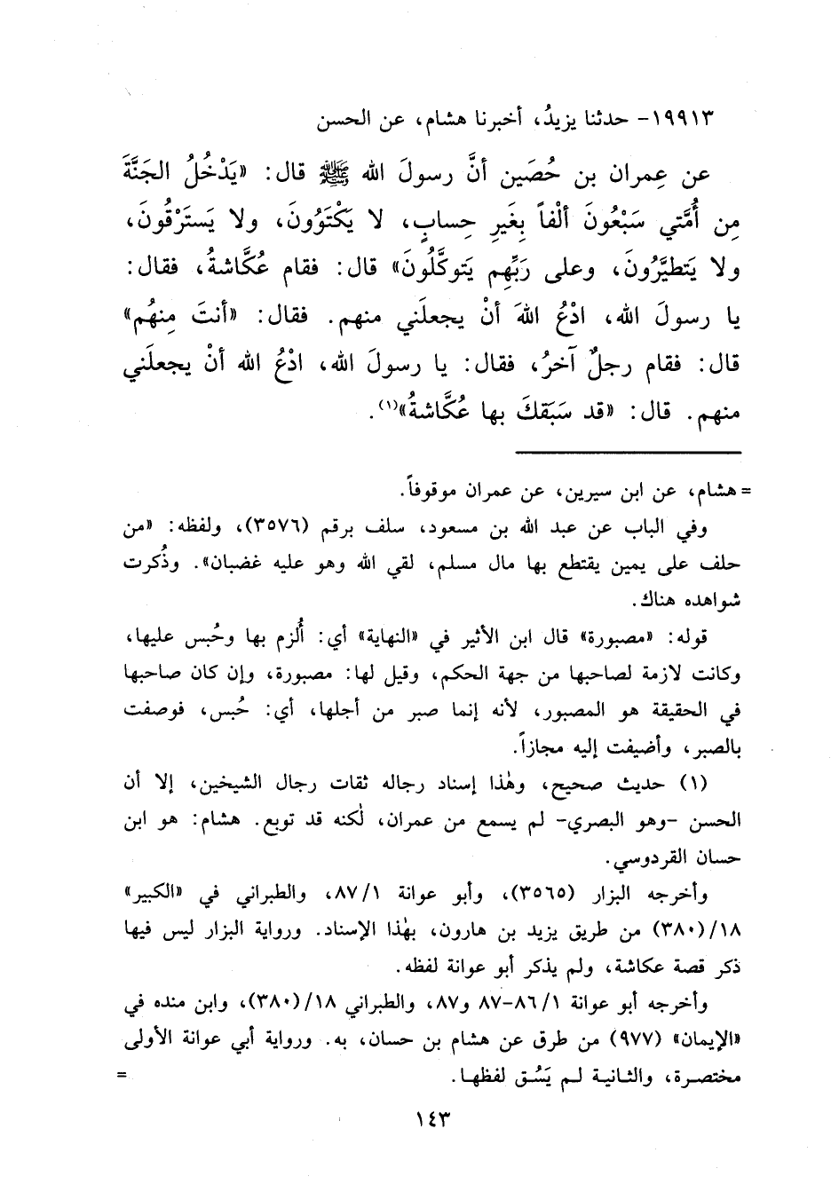 ١٩٩١٣ - حَدَّثَنَا يَزِيدُ، أَخْبَرَنَا هِشَامٌ، عَنِ الْحَسَنِ، عَنْ عِمْرَانَ بْنِ حُصَيْنٍ، أَنَّ رَسُولَ اللهِ صَلَّى اللهُ عَلَيْهِ وَسَلَّمَ قَالَ: " يَدْخُلُ الْجَنَّةَ مِنْ أُمَّتِي سَبْعُونَ أَلْفًا بِغَيْرِ حِسَابٍ لَا يَكْتَوُونَ وَلَا يَسْتَرْقُونَ، وَلَا يَتَطَيَّرُونَ، وَعَلَى رَبِّهِمْ يَتَوَكَّلُونَ ". قَالَ: فَقَامَ عُكَّاشَةُ فَقَالَ: يَا رَسُولَ اللهِ، ادْعُ اللهَ أَنْ يَجْعَلَنِي مِنْهُمْ. فَقَالَ: " أَنْتَ مِنْهُمْ ". قَالَ: فَقَامَ رَجُلٌ آخَرُ فَقَالَ: يَا رَسُولَ اللهِ، ادْعُ اللهَ أَنْ يَجْعَلَنِي مِنْهُمْ. قَالَ: " قَدْ سَبَقَكَ بِهَا عُكَّاشَةُ " (١)