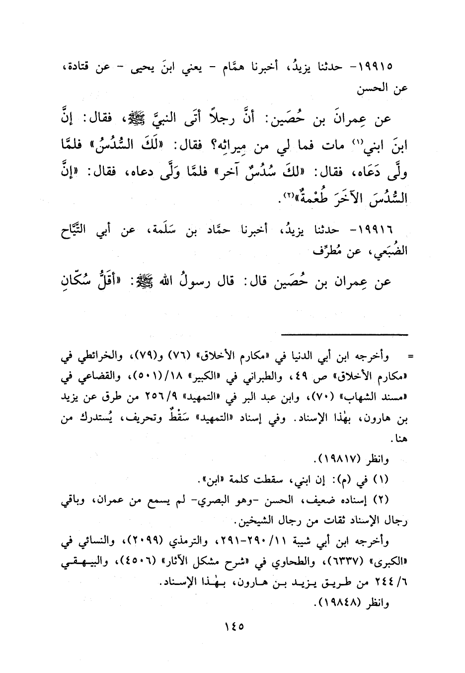 ١٩٩١٥ - حَدَّثَنَا يَزِيدُ، أَخْبَرَنَا هَمَّامٌ يَعْنِي ابْنَ يَحْيَى، عَنْ قَتَادَةَ، عَنِ الْحَسَنِ، عَنْ عِمْرَانَ بْنِ حُصَيْنٍ، أَنَّ رَجُلًا أَتَى النَّبِيَّ صَلَّى اللهُ عَلَيْهِ وَسَلَّمَ فَقَالَ: إِنَّ ابْنَ ابْنِي (١) مَاتَ، فَمَا لِي مِنْ مِيرَاثِهِ؟ فَقَالَ: " لَكَ السُّدُسُ ". فَلَمَّا وَلَّى دَعَاهُ فَقَالَ: " لَكَ سُدُسٌ آخَرُ ". فَلَمَّا وَلَّى دَعَاهُ فَقَالَ: " إِنَّ السُّدُسَ الْآخَرَ طُعْمَةٌ " (٢)