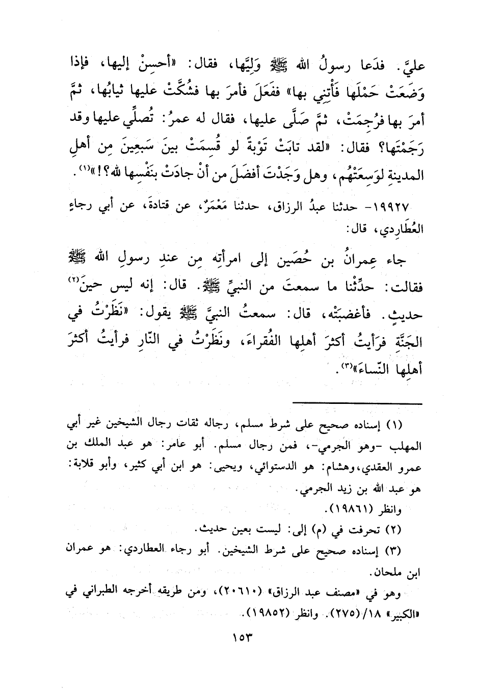 ١٩٩٢٧ - حَدَّثَنَا عَبْدُ الرَّزَّاقِ، حَدَّثَنَا مَعْمَرٌ، عَنْ قَتَادَةَ، عَنْ أَبِي رَجَاءٍ الْعُطَارِدِيِّ قَالَ: جَاءَ عِمْرَانُ بْنُ حُصَيْنٍ إِلَى امْرَأَتِهِ مِنْ عِنْدَ رَسُولِ اللهِ صَلَّى اللهُ عَلَيْهِ وَسَلَّمَ فَقَالَتْ: حَدِّثْنَا مَا سَمِعْتَ مِنَ النَّبِيِّ صَلَّى اللهُ عَلَيْهِ وَسَلَّمَ قَالَ: إِنَّهُ لَيْسَ حِيْنَ (٢) حَدِيثٍ , فَأَغْضَبَتْهُ قَالَ: سَمِعْتُ النَّبِيَّ صَلَّى اللهُ عَلَيْهِ وَسَلَّمَ يَقُولُ: " نَظَرْتُ فِي الْجَنَّةِ فَرَأَيْتُ أَكْثَرَ أَهْلِهَا الْفُقَرَاءَ، وَنَظَرْتُ فِي النَّارِ فَرَأَيْتُ أَكْثَرَ أَهْلِهَا النِّسَاءَ " (٣)