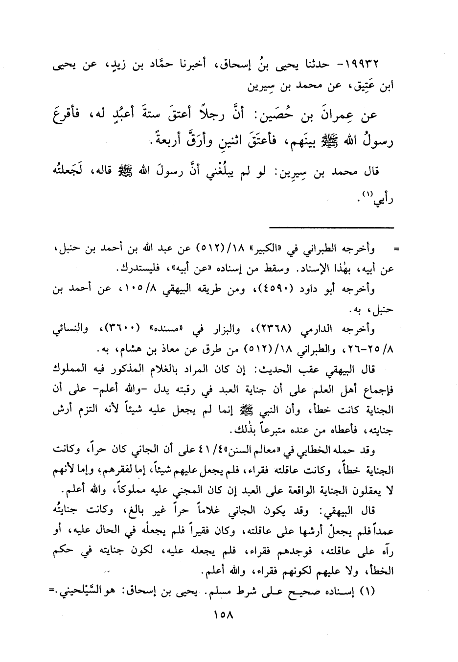 ١٩٩٣٢ - حَدَّثَنَا يَحْيَى بْنُ إِسْحَاقَ، أَخْبَرَنَا حَمَّادُ بْنُ زَيْدٍ، عَنْ يَحْيَى بْنِ عَتِيقٍ، عَنْ مُحَمَّدِ بْنِ سِيرِينَ، عَنْ عِمْرَانَ بْنِ حُصَيْنٍ، أَنَّ " رَجُلًا أَعْتَقَ سِتَّةَ أَعْبُدٍ لَهُ، فَأَقْرَعَ رَسُولُ اللهِ صَلَّى اللهُ عَلَيْهِ وَسَلَّمَ بَيْنَهُمْ فَأَعْتَقَ اثْنَيْنِ، وَأَرَقَّ أَرْبَعَةً " قَالَ مُحَمَّدُ بْنُ سِيرِينَ: لَوْ لَمْ يَبْلُغْنِي أَنَّ رَسُولَ اللهِ صَلَّى اللهُ عَلَيْهِ وَسَلَّمَ قَالَهُ لَجَعَلْتُهُ رَأْيِي (١)