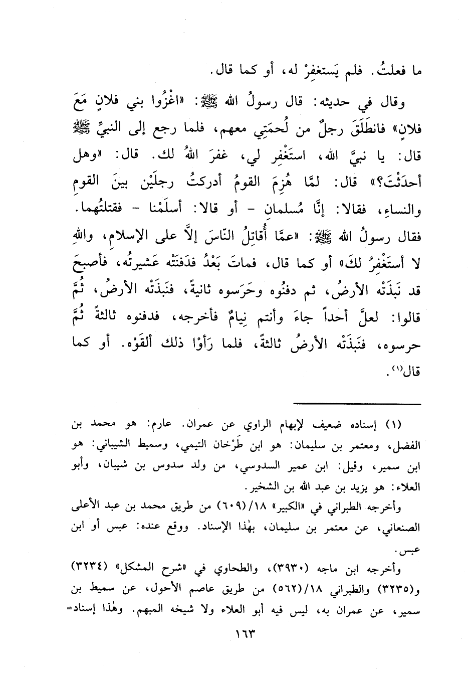 مَا فَعَلْتُ. فَلَمْ يَسْتَغْفِرْ لَهُ أَوْ كَمَا قَالَ، وَقَالَ فِي حَدِيثِهِ: قَالَ رَسُولُ اللهِ صَلَّى اللهُ عَلَيْهِ وَسَلَّمَ: " اغْزُوا بَنِي فُلَانٍ مَعَ فُلَانٍ، فَانْطَلَقَ رَجُلٌ مِنْ لُحْمَتِي مَعَهُمْ، فَلَمَّا رَجَعَ إِلَى النَّبِيِّ صَلَّى اللهُ عَلَيْهِ وَسَلَّمَ قَالَ: يَا نَبِيَّ اللهِ اسْتَغْفِرِ لِي غَفَرَ اللهُ لَكَ. قَالَ: " وَهَلْ أَحْدَثْتَ؟ " قَالَ: لَمَّا هُزِمَ الْقَوْمُ أَدْرَكْتُ رَجُلَيْنِ بَيْنَ الْقَوْمِ وَالنِّسَاءِ فَقَالَا: إِنَّا مُسْلِمَانِ أَوْ قَالَا: أَسْلَمْنَا فَقَتَلْتُهُمَا فَقَالَ رَسُولُ اللهِ صَلَّى اللهُ عَلَيْهِ وَسَلَّمَ: عَمَّا أُقَاتِلُ النَّاسَ إِلَّا عَلَى الْإِسْلَامِ؟ وَاللهِ لَا أَسْتَغْفِرُ لَكَ ". أَوْ كَمَا قَالَ: فَمَاتَ بَعْدُ فَدَفَنَتْهُ عَشِيرَتُهُ، فَأَصْبَحَ قَدْ نَبَذَتْهُ الْأَرْضُ، ثُمَّ دَفَنُوهُ وَحَرَسُوهُ ثَانِيَةً فَنَبَذَتْهُ الْأَرْضُ، ثُمَّ قَالُوا: لَعَلَّ أَحَدًا جَاءَ وَأَنْتُمْ نِيَامٌ فَأَخْرَجَهُ فَدَفَنُوهُ ثَالِثَةً، ثُمَّ حَرَسُوهُ فَنَبَذَتْهُ الْأَرْضُ ثَالِثَةً، فَلَمَّا رَأَوْا ذَلِكَ أَلْقَوْهُ، أَوْ كَمَا قَالَ (١)