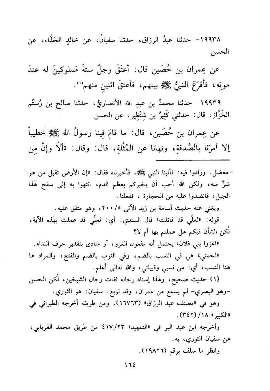 ١٩٩٣٨ - حَدَّثَنَا عَبْدُ الرَّزَّاقِ، حَدَّثَنَا سُفْيَانُ، عَنْ خَالِدٍ الْحَذَّاءِ، عَنِ الْحَسَنِ، عَنْ عِمْرَانَ بْنِ حُصَيْنٍ قَالَ: " أَعْتَقَ رَجُلٌ سِتَّةَ مَمْلُوكِينَ لَهُ عِنْدَ مَوْتِهِ، فَأَقْرَعَ النَّبِيُّ صَلَّى اللهُ عَلَيْهِ وَسَلَّمَ بَيْنَهُمْ، فَأَعْتَقَ اثْنَيْنِ مِنْهُمْ " (١)