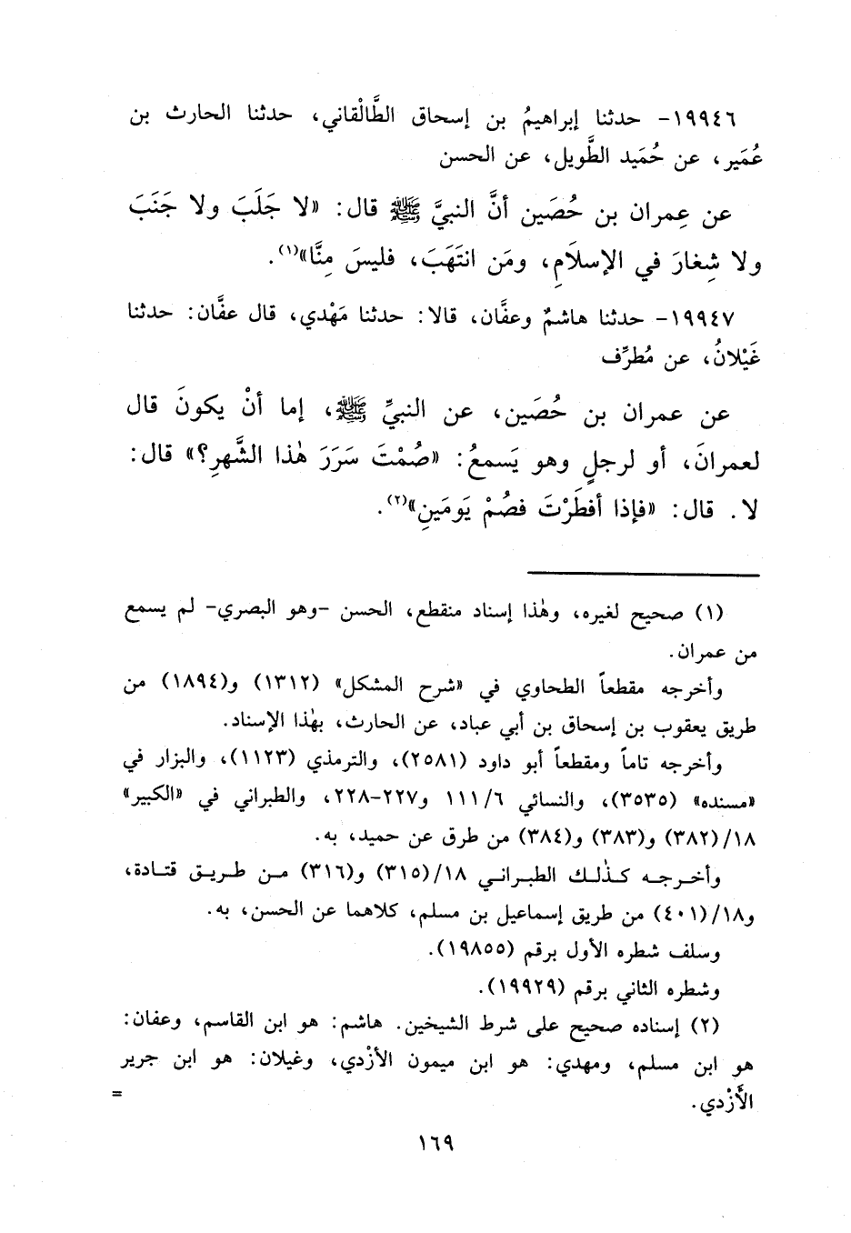 ١٩٩٤٧ - حَدَّثَنَا هَاشِمٌ، وَعَفَّانُ قَالَا: حَدَّثَنَا مَهْدِيٌّ قَالَ: عَفَّانُ، حَدَّثَنَا غَيْلَانُ، عَنْ مُطَرِّفٍ، عَنْ عِمْرَانَ بْنِ حُصَيْنٍ، عَنِ النَّبِيِّ صَلَّى اللهُ عَلَيْهِ وَسَلَّمَ إِمَّا أَنْ يَكُونَ قَالَ لِعِمْرَانَ أَوْ لِرَجُلٍ وَهُوَ يَسْمَعُ " صُمْتَ سُرَرَ هَذَا الشَّهْرِ؟ " قَالَ: لَا. قَالَ: " فَإِذَا أَفْطَرْتَ فَصُمْ يَوْمَيْنِ " (٢)
