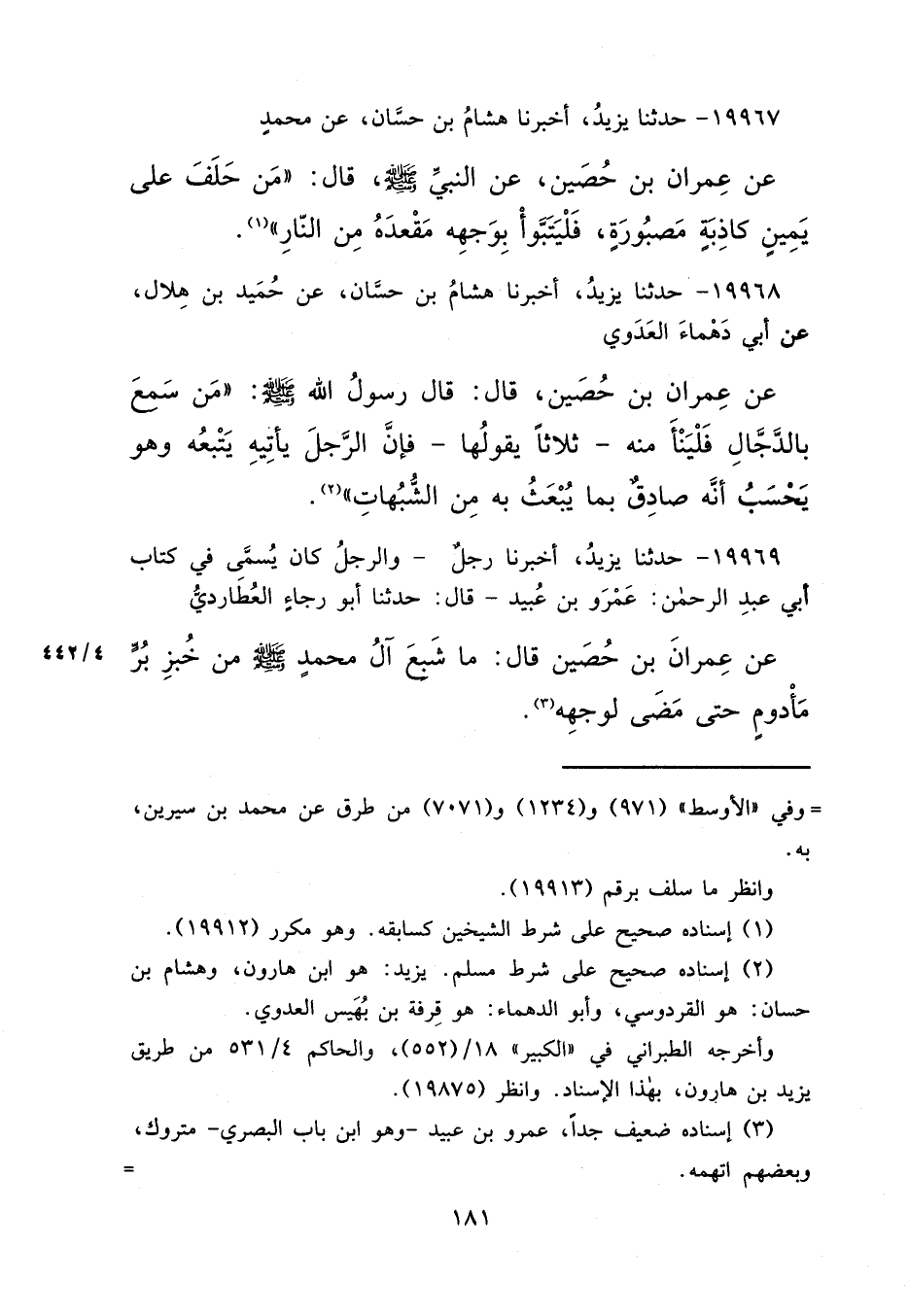 ١٩٩٦٩ - حَدَّثَنَا يَزِيدُ، أَخْبَرَنَا رَجُلٌ، وَالرَّجُلُ كَانَ يُسَمَّى فِي كِتَابِ أَبِي عَبْدِ الرَّحْمَنِ: عَمْرَو بْنَ عُبَيْدٍ، قَالَ: حَدَّثَنَا أَبُو رَجَاءٍ الْعُطَارِدِيُّ، عَنْ عِمْرَانَ بْنِ حُصَيْنٍ قَالَ: " مَا شَبِعَ آلُ مُحَمَّدٍ صَلَّى اللهُ عَلَيْهِ وَسَلَّمَ مِنْ خُبْزِ بُرٍّ مَأْدُومٍ حَتَّى مَضَى لِوَجْهِهِ " (٣)