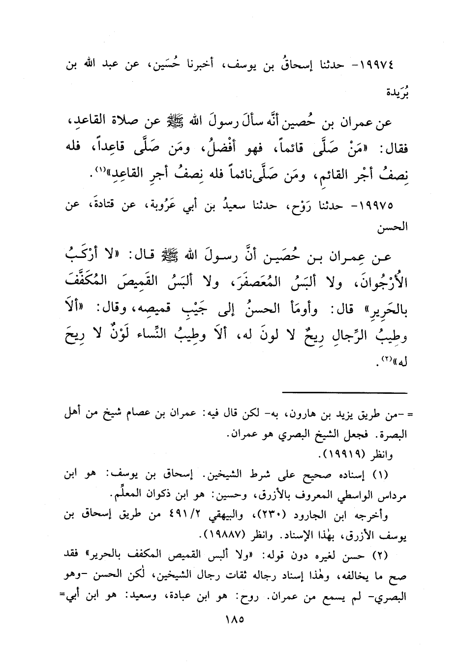 ١٩٩٧٥ - حَدَّثَنَا رَوْحٌ، حَدَّثَنَا سَعِيدُ بْنُ أَبِي عَرُوبَةَ، عَنْ قَتَادَةَ، عَنِ الْحَسَنِ، عَنْ عِمْرَانَ بْنِ حُصَيْنٍ، أَنَّ رَسُولَ اللهِ صَلَّى اللهُ عَلَيْهِ وَسَلَّمَ قَالَ: " لَا أَرْكَبُ الْأُرْجُوَانَ وَلَا أَلْبَسُ الْمُعَصْفَرَ، وَلَا أَلْبَسُ الْقَمِيصَ الْمُكَفَّفَ بِالْحَرِيرِ "، قَالَ: وَأَوْمَأَ الْحَسَنُ إِلَى جَيْبِ قَمِيصِهِ، وَقَالَ: " أَلَا وَطِيبُ الرِّجَالِ رِيحٌ لَا لَوْنَ لَهُ. أَلَا وَطِيبُ النِّسَاءِ لَوْنٌ لَا رِيحَ لَهُ " (٢)