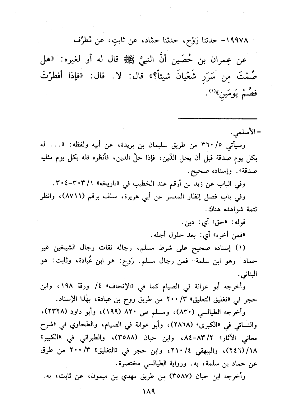١٩٩٧٨ - حَدَّثَنَا رَوْحٌ، حَدَّثَنَا حَمَّادٌ، عَنْ ثَابِتٍ، عَنْ مُطَرِّفٍ، عَنْ عِمْرَانَ بْنِ حُصَيْنٍ، أَنَّ النَّبِيَّ صَلَّى اللهُ عَلَيْهِ وَسَلَّمَ قَالَ لَهُ أَوْ لِغَيْرِهِ: " هَلْ صُمْتَ مِنْ سُرَرِ شَعْبَانَ شَيْئًا؟ " قَالَ: لَا. قَالَ: " فَإِذَا أَفْطَرْتَ فَصُمْ يَوْمَيْنِ " (١)