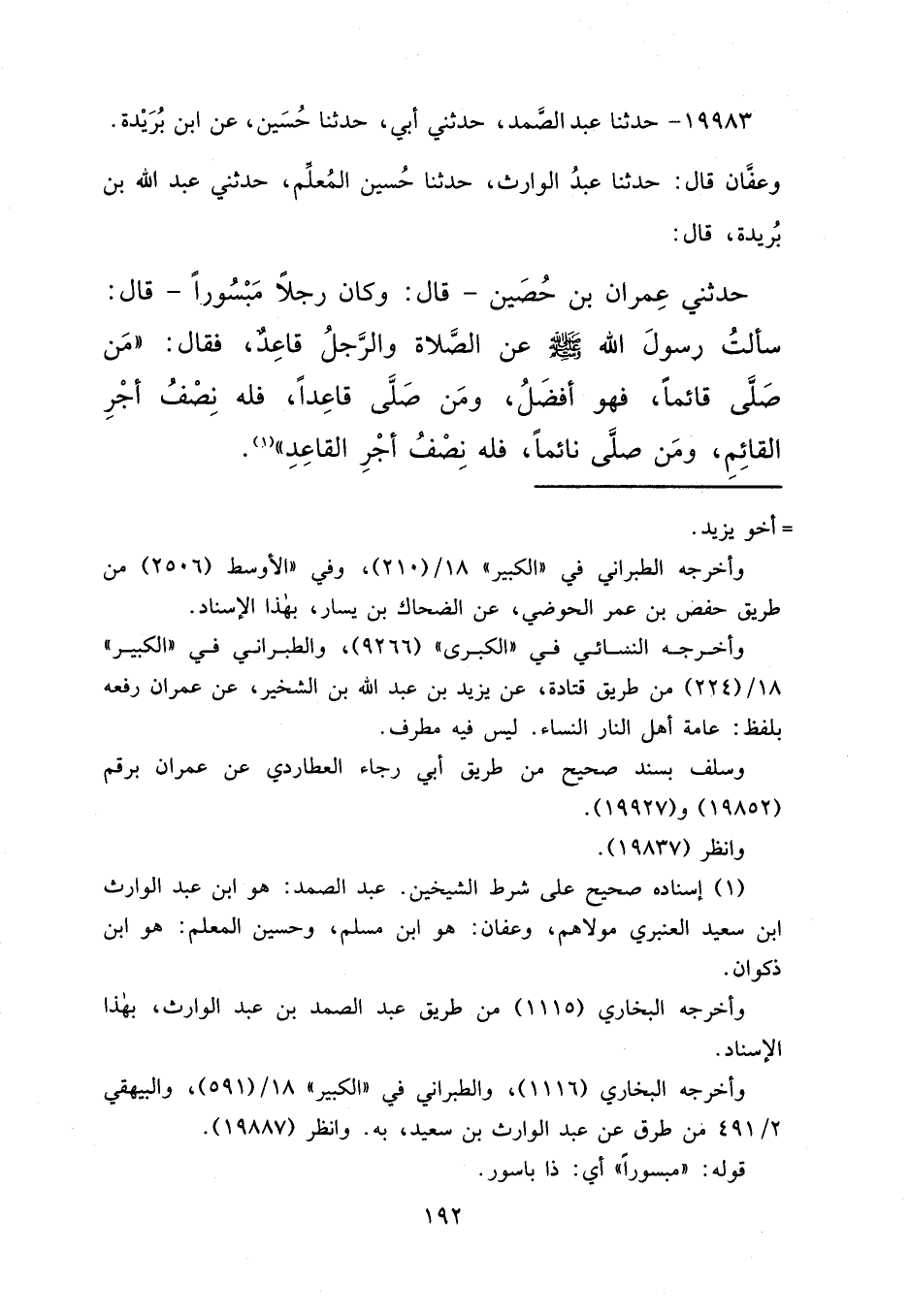 ١٩٩٨٣ - حَدَّثَنَا عَبْدُ الصَّمَدِ، حَدَّثَنَا أَبِي، حَدَّثَنَا حُسَيْنٌ، عَنِ ابْنِ بُرَيْدَةَ، وَعَفَّانُ، قَالَ: حَدَّثَنَا عَبْدُ الْوَارِثِ، حَدَّثَنَا حُسَيْنٌ الْمُعَلِّمُ، حَدَّثَنِي عَبْدُ اللهِ بْنُ بُرَيْدَةَ قَالَ: حَدَّثَنِي عِمْرَانُ بْنُ حُصَيْنٍ قَالَ: وَكَانَ رَجُلًا مَبْسُورًا قَالَ: سَأَلْتُ رَسُولَ اللهِ صَلَّى اللهُ عَلَيْهِ وَسَلَّمَ عَنِ الصَّلَاةِ وَالرَّجُلُ قَاعِدٌ فَقَالَ: " مَنْ صَلَّى قَائِمًا فَهُوَ أَفْضَلُ، وَمَنْ صَلَّى قَاعِدًا فَلَهُ نِصْفُ أَجْرِ الْقَائِمِ، وَمَنْ صَلَّى نَائِمًا فَلَهُ نِصْفُ أَجْرِ الْقَاعِدِ " (١)