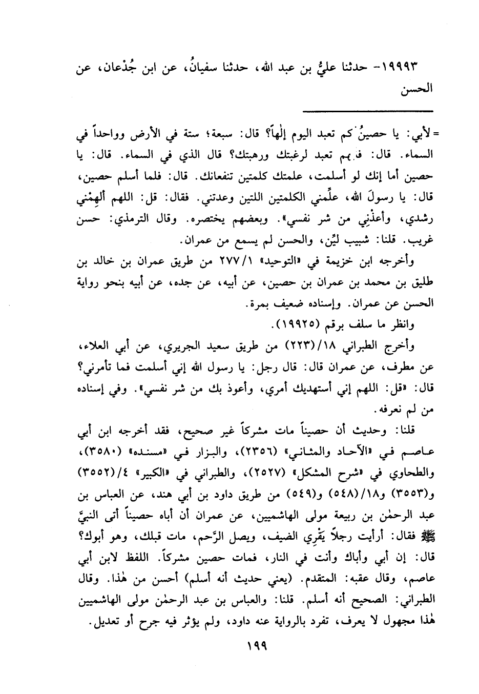 = لأبي: يا حصينُْ كم تعبد اليوم إلهاَ؟ قال: سبعة: ستة في الأرض وواحداً في السماء. قال: فأيهم تعبد لرغبتك ورهبتك؟ قال الذي في السماء. قال: يا حصين أما إنك لو أسلمت، علمتك كلمتين تنفعانك. قال: فلما أسلم حصين، قال: يا رسولَ الله، علَّمني الكلمتين اللتين وعدتني. فقال: قل: اللهم ألهِمني رشدي، وأعذنِي من شر نفسي". وبعضهم يختصره. وقال الترمذي: حسن غريب. قلنا: شبيب ليَّن، والحسن لم يسمع من عمران.