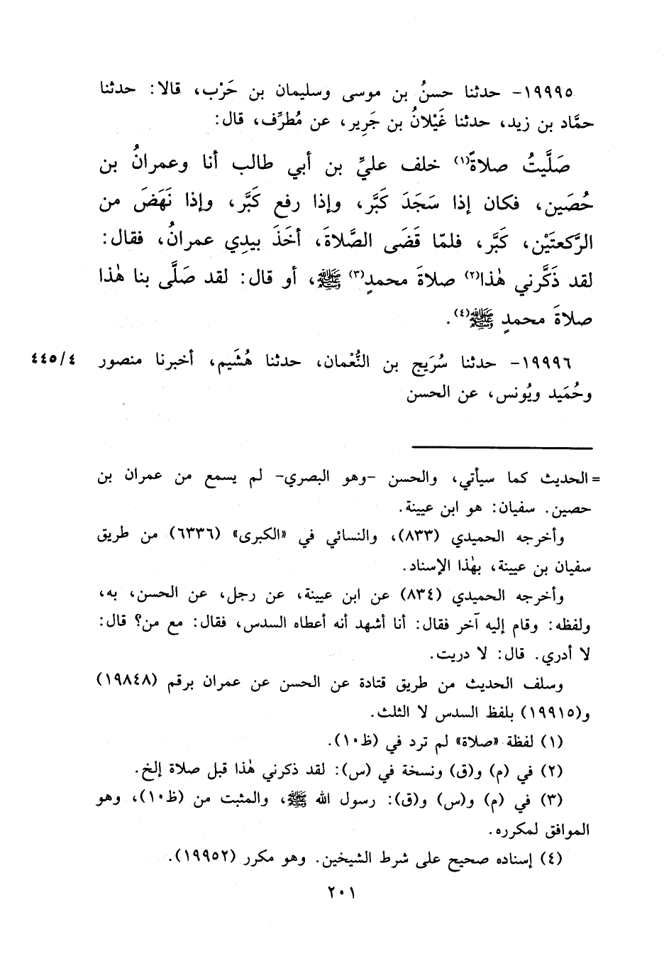 ١٩٩٩٥ - حَدَّثَنَا حَسَنُ بْنُ مُوسَى، وَسُلَيْمَانُ بْنُ حَرْبٍ قَالَا: حَدَّثَنَا حَمَّادُ بْنُ زَيْدٍ، حَدَّثَنَا غَيْلَانُ بْنُ جَرِيرٍ، عَنْ مُطَرِّفٍ قَالَ: صَلَّيْتُ صَلَاةً (١) خَلْفَ عَلِيِّ بْنِ أَبِي طَالِبٍ أَنَا وَعِمْرَانُ بْنُ حُصَيْنٍ، فَكَانَ إِذَا سَجَدَ كَبَّرَ، وَإِذَا رَفَعَ كَبَّرَ، وَإِذَا نَهَضَ مِنَ الرَّكْعَتَيْنِ كَبَّرَ، فَلَمَّا قَضَى الصَّلَاةَ أَخَذَ بِيَدِي عِمْرَانُ فَقَالَ: " لَقَدْ ذَكَّرَنِي هَذَا (٢) صَلَاةَ مُحَمَّدٍ صَلَّى اللهُ عَلَيْهِ وَسَلَّمَ " (٣) أَوْ قَالَ: لَقَدْ صَلَّى بِنَا هَذَا صَلَاةَ مُحَمَّدٍ صَلَّى اللهُ عَلَيْهِ وَسَلَّمَ (٤)