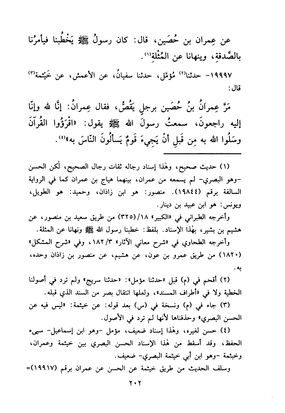 (٤) حسن لغيره، وهذا إسناد ضعيف، مؤمل - وهو ابن إسماعيل- سيئ الحفظ، وقد أسقط من هذا الإسناد الحسن البصري بين خيثمة وعمران، وخيثمة - وهو ابن أبي خيثمة البصري- ضعيف.