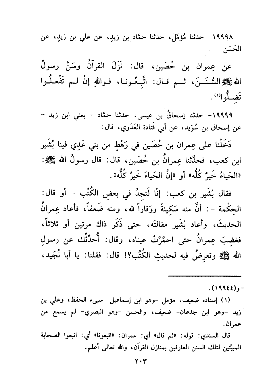 ١٩٩٩٨ - حَدَّثَنَا مُؤَمَّلٌ، حَدَّثَنَا حَمَّادُ بْنُ زَيْدٍ، عَنْ عَلِيِّ بْنِ زَيْدٍ، عَنِ الْحَسَنِ، عَنْ عِمْرَانَ بْنِ حُصَيْنٍ قَالَ: نَزَلَ الْقُرْآنُ وَسَنَّ رَسُولُ اللهِ صَلَّى اللهُ عَلَيْهِ وَسَلَّمَ السُّنَنَ، ثُمَّ قَالَ: " اتَّبِعُونَا فَوَاللهِ إِنْ لَمْ تَفْعَلُوا تَضِلُّوا " (١)