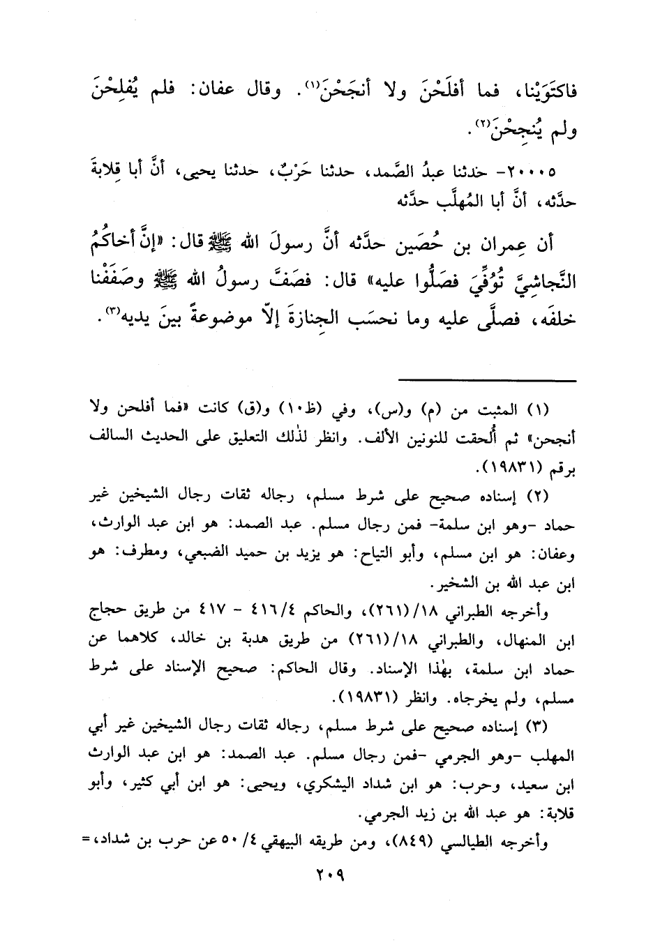 ٢٠٠٠٥ - حَدَّثَنَا عَبْدُ الصَّمَدِ، حَدَّثَنَا حَرْبٌ، حَدَّثَنَا يَحْيَى، أَنَّ أَبَا قِلَابَةَ حَدَّثَهُ، أَنَّ أَبَا الْمُهَلَّبِ حَدَّثَهُ، أَنَّ عِمْرَانَ بْنَ حُصَيْنٍ حَدَّثَهُ، أَنَّ رَسُولَ اللهِ صَلَّى اللهُ عَلَيْهِ وَسَلَّمَ قَالَ: " إِنَّ أَخَاكُمْ النَّجَاشِيَّ تُوُفِّيَ فَصَلُّوا عَلَيْهِ " قَالَ: فَصَفَّ رَسُولُ اللهِ صَلَّى اللهُ عَلَيْهِ وَسَلَّمَ، وَصَفَفْنَا خَلْفَهُ فَصَلَّى عَلَيْهِ، وَمَا نَحْسِبُ الْجِنَازَةَ إِلَّا مَوْضُوعَةً بَيْنَ يَدَيْهِ (٣)