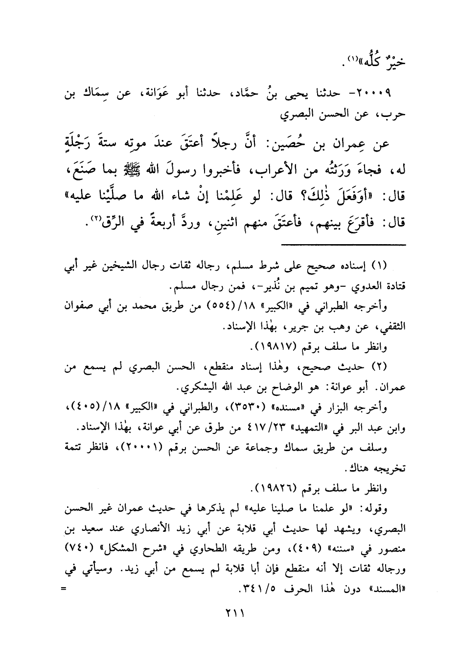 ٢٠٠٠٩ - حَدَّثَنَا يَحْيَى بْنُ حَمَّادٍ، حَدَّثَنَا أَبُو عَوَانَةَ، عَنْ سِمَاكِ بْنِ حَرْبٍ، عَنِ الْحَسَنِ الْبَصْرِيِّ، عَنْ عِمْرَانَ بْنِ حُصَيْنٍ، أَنَّ رَجُلًا أَعْتَقَ عِنْدَ مَوْتِهِ سِتَّةَ رَجْلَةٍ لَهُ، فَجَاءَ وَرَثَتُهُ مِنَ الْأَعْرَابِ، فَأَخْبَرُوا رَسُولَ اللهِ صَلَّى اللهُ عَلَيْهِ وَسَلَّمَ بِمَا صَنَعَ. قَالَ: " أَوَفَعَلَ ذَلِكَ؟ قَالَ: لَوْ عَلِمْنَا إِنْ شَاءَ اللهُ مَا صَلَّيْنَا عَلَيْهِ ". قَالَ: فَأَقْرَعَ بَيْنَهُمْ فَأَعْتَقَ مِنْهُمْ اثْنَيْنِ، وَرَدَّ أَرْبَعَةً فِي الرِّقِّ (٢)