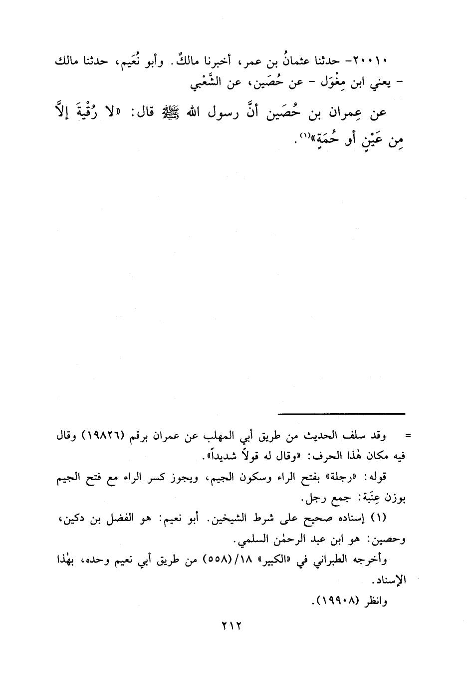 ٢٠٠١٠ - حَدَّثَنَا عُثْمَانُ بْنُ عُمَرَ، أَخْبَرَنَا مَالِكٌ، وَأَبُو نُعَيْمٍ، حَدَّثَنَا مَالِكٌ يَعْنِي ابْنَ مِغْوَلٍ، عَنْ حُصَيْنٍ، عَنِ الشَّعْبِيِّ، عَنْ عِمْرَانَ بْنِ حُصَيْنٍ، أَنَّ رَسُولَ اللهِ صَلَّى اللهُ عَلَيْهِ وَسَلَّمَ قَالَ: " لَا رُقْيَةَ إِلَّا مِنْ عَيْنٍ أَوْ حُمَةٍ " (١)