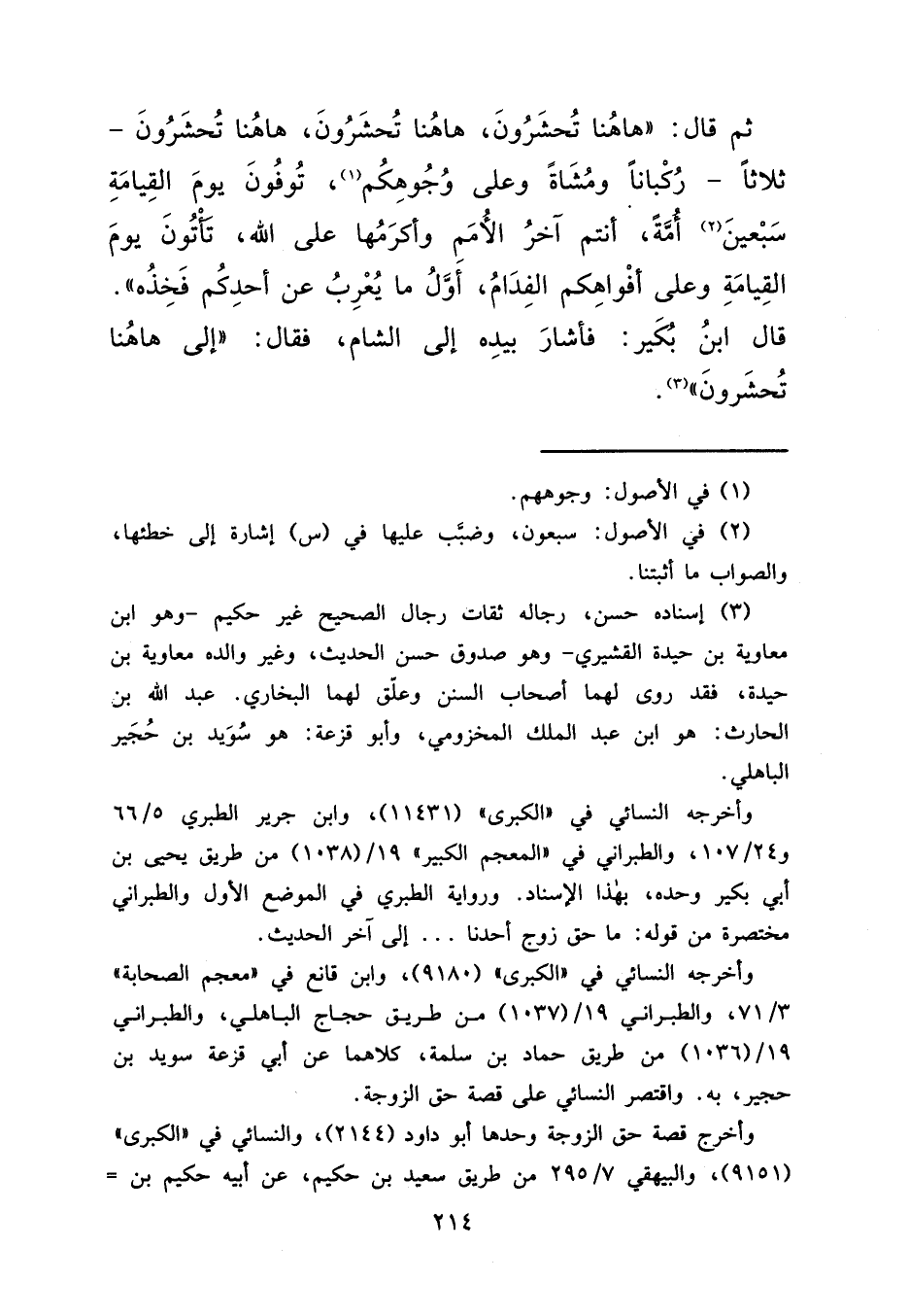 ثُمَّ قَالَ: " هَاهُنَا تُحْشَرُونَ. هَاهُنَا تُحْشَرُونَ. هَاهُنَا تُحْشَرُونَ.، ثَلَاثًا، رُكْبَانًا وَمُشَاةً، وَعَلَى وُجُوهِكُمْ (١) تُوفُونَ يَوْمَ الْقِيَامَةِ سَبْعِينَ (٢) أُمَّةً أَنْتُمْ آخِرُ الْأُمَمِ وَأَكْرَمُهَا عَلَى اللهِ تَأْتُونَ يَوْمَ الْقِيَامَةِ وَعَلَى أَفْوَاهِكُمُ الْفِدَامُ. أَوَّلُ مَا يُعْرِبُ عَنْ أَحَدِكُمْ فَخِذُهُ " قَالَ ابْنُ أَبِي بُكَيْرٍ: فَأَشَارَ بِيَدِهِ إِلَى الشَّامِ فَقَالَ: " إِلَى هَاهُنَا تُحْشَرُونَ (٣)