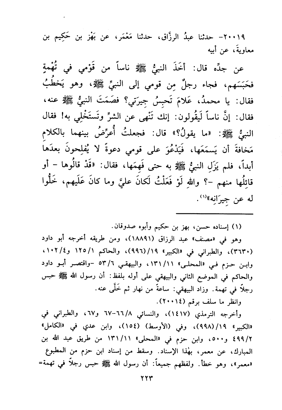 ٢٠٠١٩ - حَدَّثَنَا عَبْدُ الرَّزَّاقِ، حَدَّثَنَا مَعْمَرٌ، عَنْ بَهْزِ بْنِ حَكِيمِ بْنِ مُعَاوِيَةَ، عَنْ أَبِيهِ، عَنْ جَدِّهِ قَالَ: أَخَذَ النَّبِيُّ صَلَّى اللهُ عَلَيْهِ وَسَلَّمَ نَاسًا مِنْ قَوْمِي فِي تُهْمَةٍ فَحَبَسَهُمْ، فَجَاءَ رَجُلٌ مِنْ قَوْمِي إِلَى النَّبِيِّ صَلَّى اللهُ عَلَيْهِ وَسَلَّمَ وَهُوَ يَخْطُبُ، فَقَالَ: يَا مُحَمَّدُ عَلَامَ تَحْبِسُ جِيرَتِي؟ فَصَمَتَ النَّبِيُّ صَلَّى اللهُ عَلَيْهِ وَسَلَّمَ عَنْهُ فَقَالَ: إِنَّ نَاسًا لَيَقُولُونَ إِنَّكَ تَنْهَى عَنِ الشَّرِّ، وَتَسْتَخْلِي بِهِ، فَقَالَ النَّبِيُّ صَلَّى اللهُ عَلَيْهِ وَسَلَّمَ: " مَا يَقُولُ؟ " قَالَ: فَجَعَلْتُ أَعْرِضُ بَيْنَهُمَا بِالْكَلَامِ مَخَافَةَ أَنْ يَسْمَعَهَا، فَيَدْعُوَ عَلَى قَوْمِي دَعْوَةً، لَا يُفْلِحُونَ بَعْدَهَا أَبَدًا، فَلَمْ يَزَلِ النَّبِيُّ صَلَّى اللهُ عَلَيْهِ وَسَلَّمَ بِهِ حَتَّى فَهِمَهَا فَقَالَ: " قَدْ قَالُوهَا أَوْ قَائِلُهَا مِنْهُمْ، وَاللهِ لَوْ فَعَلْتُ لَكَانَ عَلَيَّ، وَمَا كَانَ عَلَيْهِمْ خَلُّوا لَهُ عَنْ جِيرَانِهِ " (١)