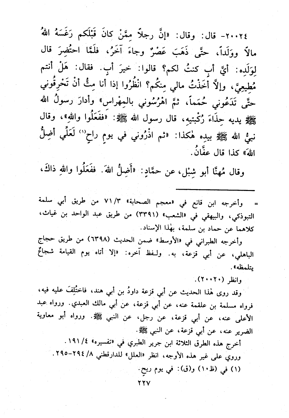 ٢٠٠٢٤ - قَالَ: وَقَالَ: " إِنَّ رَجُلًا مِمَّنْ كَانَ قَبْلَكُمْ رَغَسَهُ اللهُ مَالًا وَوَلَدًا حَتَّى ذَهَبَ عَصْرٌ، وَجَاءَ آخَرُ، فَلَمَّا احْتُضِرَ قَالَ لِوَلَدِهِ: أَيَّ أَبٍ كُنْتُ لَكُمْ؟ قَالُوا: خَيْرَ أَبٍ. فَقَالَ: هَلْ أَنْتُمْ مُطِيعِيَّ؟ وَإِلَّا أَخَذْتُ مَالِي مِنْكُمْ. انْظُرُوا إِذَا أَنَا مُتُّ أَنْ تُحَرِّقُونِي حَتَّى تَدَعُونِي حُمَمًا، ثُمَّ اهْرُسُونِي بِالْمِهْرَاسِ "، وَأَدَارَ رَسُولُ اللهِ صَلَّى اللهُ عَلَيْهِ وَسَلَّمَ يَدَيْهِ حِذَاءَ رُكْبَتَيْهِ، قَالَ رَسُولُ اللهِ صَلَّى اللهُ عَلَيْهِ وَسَلَّمَ: " فَفَعَلُوا وَاللهِ ".، وَقَالَ نَبِيُّ اللهِ صَلَّى اللهُ عَلَيْهِ وَسَلَّمَ بِيَدِهِ هَكَذَا، " ثُمَّ اذْرُونِي فِي يَوْمٍ رَاحٍ (١) لَعَلِّي أَضِلُّ اللهَ ". كَذَا قَالَ عَفَّانُ، وَقَالَ مُهَنَّا أَبُو شِبْلٍ، عَنْ حَمَّادٍ: " أَضِلُّ اللهَ فَفَعَلُوا، وَاللهِ ذَاكَ