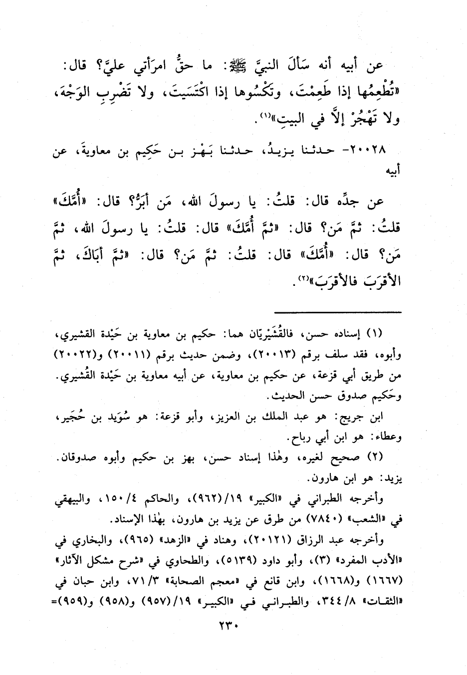 ٢٠٠٢٨ - حَدَّثَنَا يَزِيدُ، حَدَّثَنَا بَهْزُ بْنُ حَكِيمِ بْنِ مُعَاوِيَةَ، عَنْ أَبِيهِ، عَنْ جَدِّهِ قَالَ: قُلْتُ: يَا رَسُولَ اللهِ مَنْ أَبَرُّ؟ قَالَ: " أُمَّكَ ". قُلْتُ: ثُمَّ مَنْ؟ قَالَ: " ثُمَّ أُمَّكَ ". قَالَ: قُلْتُ: يَا رَسُولَ اللهِ، ثُمَّ مَنْ؟ قَالَ: " أُمَّكَ ". قَالَ: قُلْتُ: ثُمَّ مَنْ؟ قَالَ: " ثُمَّ أَبَاكَ، ثُمَّ الْأَقْرَبَ فَالْأَقْرَبَ " (٢)