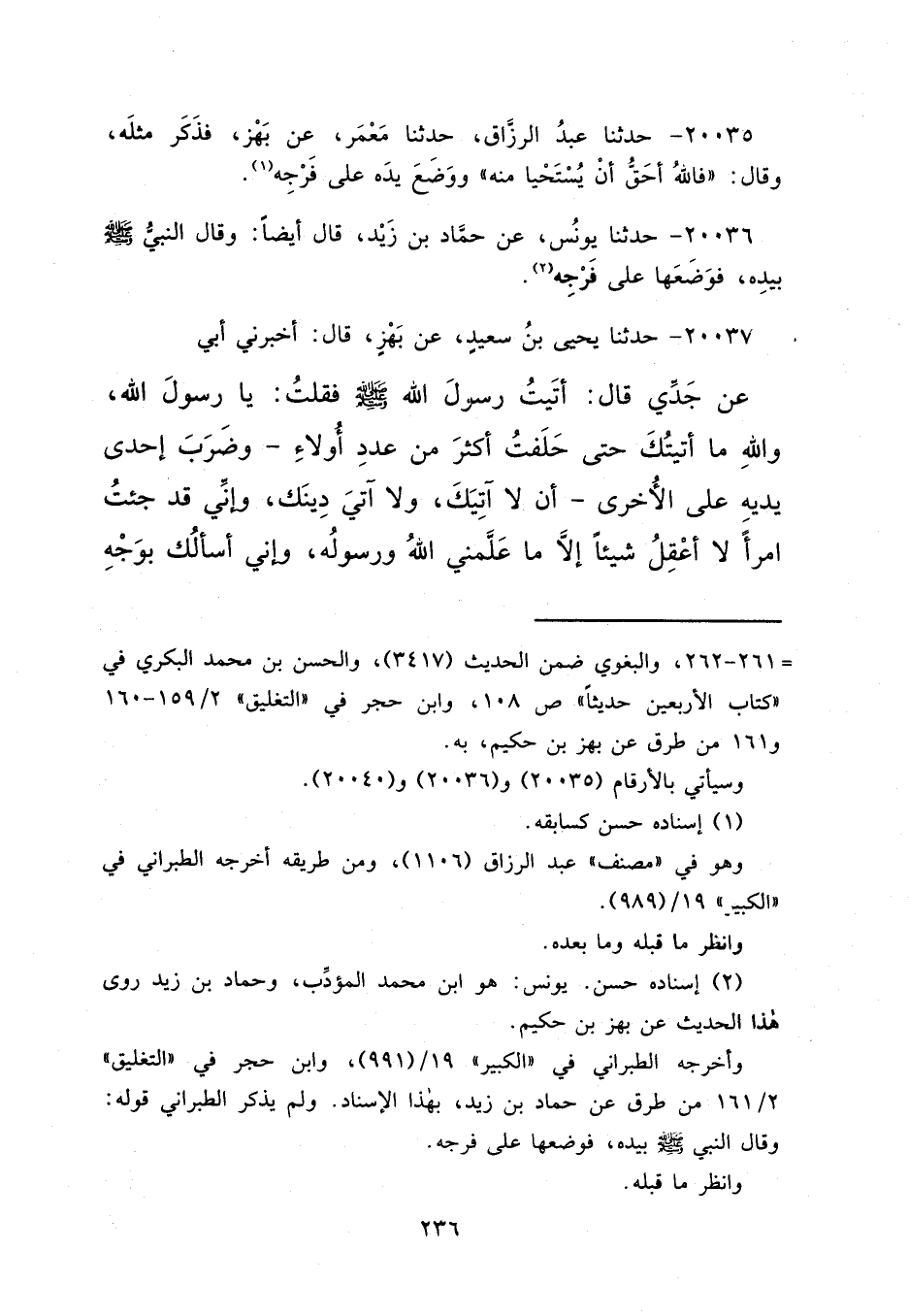 ٢٠٠٣٦ - حَدَّثَنَا يُونُسُ، عَنْ حَمَّادِ بْنِ زَيْدٍ قَالَ: أَيْضًا وَقَالَ النَّبِيُّ صَلَّى اللهُ عَلَيْهِ وَسَلَّمَ بِيَدِهِ، فَوَضَعَهَا عَلَى فَرْجِهِ (٢)