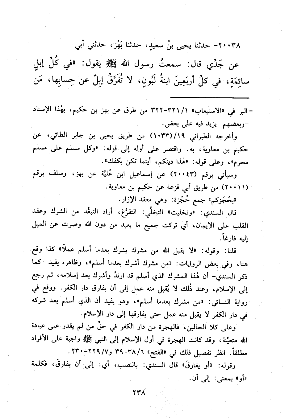٢٠٠٣٨ - حَدَّثَنَا يَحْيَى بْنُ سَعِيدٍ، حَدَّثَنَا بَهْزٌ، حَدَّثَنِي أَبِي، عَنْ جَدِّي قَالَ: سَمِعْتُ رَسُولَ اللهِ صَلَّى اللهُ عَلَيْهِ وَسَلَّمَ يَقُولُ: " فِي كُلِّ إِبِلٍ سَائِمَةٍ فِي كُلِّ أَرْبَعِينَ ابْنَةُ لَبُونٍ لَا تُفَرَّقُ إِبِلٌ عَنْ حِسَابِهَا. مَنْ
