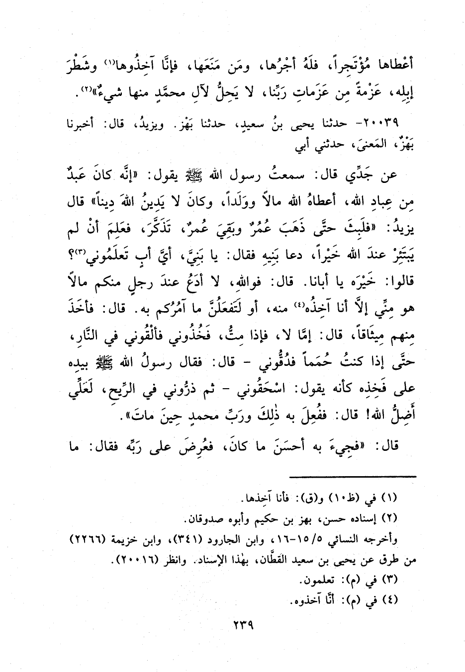 ٢٠٠٣٩ - حَدَّثَنَا يَحْيَى بْنُ سَعِيدٍ، حَدَّثَنَا بَهْزٌ، وَيَزِيدُ قَالَ: أَخْبَرَنَا بَهْزٌ الْمَعْنَى، حَدَّثَنِي أَبِي، عَنْ جَدِّي قَالَ: سَمِعْتُ رَسُولَ اللهِ صَلَّى اللهُ عَلَيْهِ وَسَلَّمَ يَقُولُ: " إِنَّهُ كَانَ عَبْدٌ مِنْ عِبَادِ اللهِ أَعْطَاهُ اللهُ مَالًا وَوَلَدًا، وَكَانَ لَا يَدِينُ اللهَ دِينًا. قَالَ يَزِيدُ: فَلَبِثَ حَتَّى ذَهَبَ عُمُرٌ وَبَقِيَ عُمُرٌ تَذَكَّرَ فَعَلِمَ أَنْ لَمْ يَبْتَئِرْ عِنْدَ اللهِ خَيْرًا دَعَا بَنِيهِ فَقَالَ: يَا بَنِيَّ أَيَّ أَبٍ تَعْلَمُونِي (٣) ؟ قَالُوا: خَيْرَهُ يَا أَبَانَا. قَالَ: فَوَاللهِ لَا أَدَعُ عِنْدَ رَجُلٍ مِنْكُمْ مَالًا هُوَ مِنِّي إِلَّا أَنَا آخِذُهُ (٤) مِنْهُ، أَوْ لَتَفْعَلُنَّ مَا آمُرُكُمْ بِهِ. قَالَ: فَأَخَذَ مِنْهُمْ مِيثَاقًا. قَالَ: إِمَّا لَا فَإِذَا مُتُّ فَخُذُونِي فَأَلْقُونِي فِي النَّارِ حَتَّى إِذَا كُنْتُ حُمَمًا فَدُقُّونِي ". قَالَ: فَقَالَ رَسُولُ اللهِ صَلَّى اللهُ عَلَيْهِ وَسَلَّمَ بِيَدِهِ عَلَى فَخِذِهِ، كَأَنَّهُ يَقُولُ: " اسْحَقُونِي، ثُمَّ ذَرُّونِي فِي الرِّيحِ لَعَلِّي أَضِلُّ اللهَ ". قَالَ: " فَفُعِلَ بِهِ ذَلِكَ وَرَبِّ مُحَمَّدٍ حِينَ مَاتَ. قَالَ: فَجِيءَ بِهِ أَحْسَنَ مَا كَانَ، فَعُرِضَ عَلَى رَبِّهِ فَقَالَ: " مَا