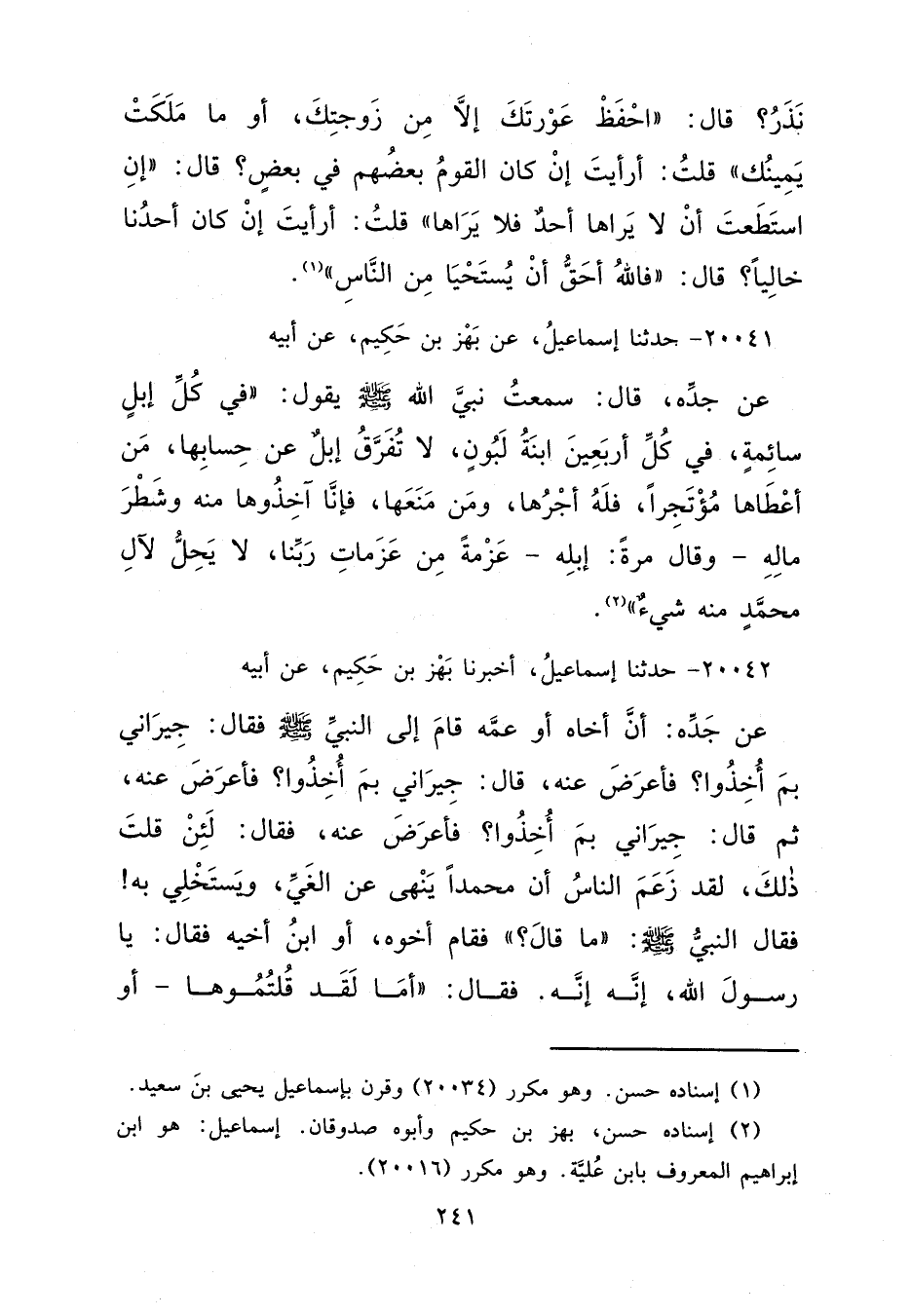 ٢٠٠٤١ - حَدَّثَنَا إِسْمَاعِيلُ، عَنْ بَهْزِ بْنِ حَكِيمٍ، عَنْ أَبِيهِ، عَنْ جَدِّهِ قَالَ: سَمِعْتُ نَبِيَّ اللهِ صَلَّى اللهُ عَلَيْهِ وَسَلَّمَ يَقُولُ " فِي كُلِّ إِبِلٍ سَائِمَةٌ، فِي كُلِّ أَرْبَعِينَ ابْنَةُ لَبُونٍ، لَا تُفَرَّقُ إِبِلٌ عَنْ حِسَابِهَا. مَنْ أَعْطَاهَا مُؤْتَجِرًا فَلَهُ أَجْرُهَا، وَمَنْ مَنَعَهَا فَإِنَّا آخِذُوهَا مِنْهُ وَشَطْرَ مَالِهِ "، وَقَالَ مَرَّةً،: " إِبِلِهِ عَزْمَةً مِنْ عَزَمَاتِ رَبِّنَا لَا يَحِلُّ لِآلِ مُحَمَّدٍ مِنْهُ شَيْءٌ " (٢)