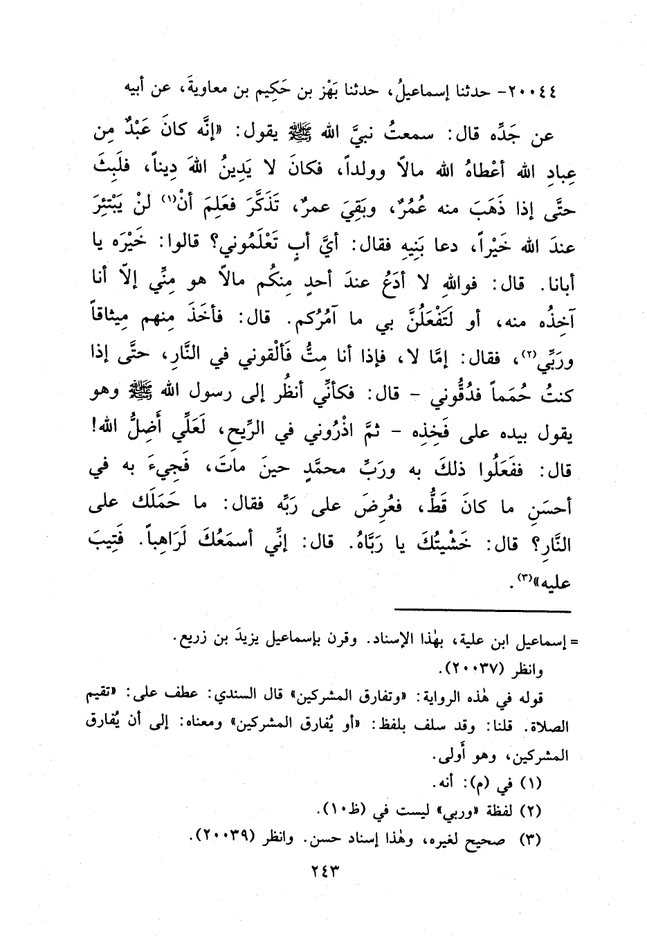 ٢٠٠٤٤ - حَدَّثَنَا إِسْمَاعِيلُ، حَدَّثَنَا بَهْزُ بْنُ حَكِيمِ بْنِ مُعَاوِيَةَ، عَنْ أَبِيهِ، عَنْ جَدِّهِ قَالَ: سَمِعْتُ نَبِيَّ اللهِ صَلَّى اللهُ عَلَيْهِ وَسَلَّمَ يَقُولُ: " إِنَّهُ كَانَ عَبْدٌ مِنْ عِبَادِ اللهِ أَعْطَاهُ اللهُ مَالًا وَوَلَدًا، فَكَانَ لَا يَدِينُ اللهَ دِينًا، فَلَبِثَ حَتَّى إِذَا ذَهَبَ مِنْهُ عُمُرٌ، وَبَقِيَ عُمُرٌ تَذَكَّرَ، فَعَلِمَ أَنْ (١) لَنْ يَبْتَئِرَ عِنْدَ اللهِ خَيْرًا دَعَا بَنِيهِ فَقَالَ: أَيَّ أَبٍ تَعْلَمُونِي؟ قَالُوا: خَيْرَهُ يَا أَبَانَا. قَالَ: فَوَاللهِ لَا أَدَعُ عِنْدَ أَحَدٍ مِنْكُمْ مَالًا هُوَ مِنِّي إِلَّا أَنَا آخِذُهُ مِنْهُ، وَلَتَفْعَلُنَّ بِي مَا آمُرُكُمْ. قَالَ: فَأَخَذَ مِنْهُمْ مِيثَاقًا وَرَبِّي (٢) فَقَالَ: إِمَّا لَا فَإِذَا أَنَا مُتُّ فَأَلْقُونِي فِي النَّارِ حَتَّى إِذَا كُنْتُ حُمَمًا فَدُقُّونِي "، قَالَ: فَكَأَنِّي أَنْظُرُ إِلَى رَسُولِ اللهِ صَلَّى اللهُ عَلَيْهِ وَسَلَّمَ وَهُوَ يَقُولُ بِيَدِهِ عَلَى فَخِذِهِ، " ثُمَّ اذْرُونِي فِي الرِّيحِ لَعَلِّي أَضِلُّ اللهَ ". قَالَ: " فَفَعَلُوا ذَلِكَ بِهِ وَرَبِّ مُحَمَّدٍ حِينَ مَاتَ، فَجِيءَ بِهِ فِي أَحْسَنِ مَا كَانَ قَطُّ، فَعُرِضَ عَلَى رَبِّهِ فَقَالَ: " مَا حَمَلَكَ عَلَى النَّارِ؟ " قَالَ: خَشْيَتُكَ يَا رَبَّاهُ. قَالَ: " إِنِّي أَسْمَعُكَ لَرَاهِبًا، فَتِيبَ عَلَيْهِ " (٣)
