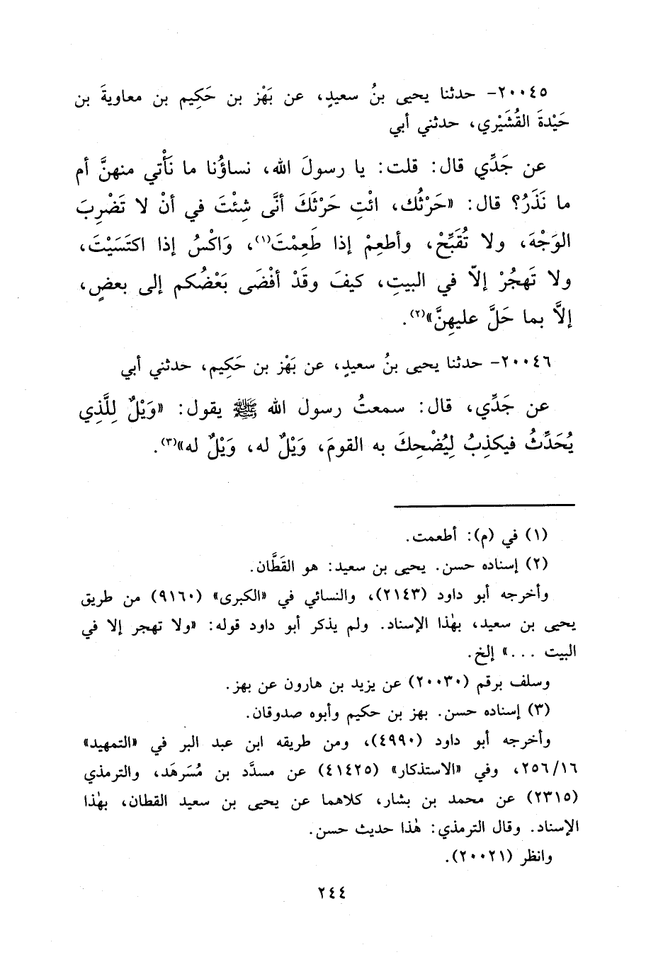 ٢٠٠٤٥ - حَدَّثَنَا يَحْيَى بْنُ سَعِيدٍ، عَنْ بَهْزِ بْنِ حَكِيمِ بْنِ مُعَاوِيَةَ بْنِ حَيْدَةَ الْقُشَيْرِيِّ، حَدَّثَنِي أَبِي، عَنْ جَدِّي، قَالَ: قُلْتُ: يَا رَسُولَ اللهِ، نِسَاؤُنَا مَا نَأْتِي مِنْهُنَّ أَمْ مَا نَذَرُ؟ قَالَ: " حَرْثُكَ، ائْتِ حَرْثَكَ أَنَّى شِئْتَ فِي أَنْ لَا تَضْرِبَ الْوَجْهَ، وَلَا تُقَبِّحْ، وَأَطْعِمْ إِذَا أُطْعِمْتَ، (١) وَاكْسُ إِذَا اكْتَسَيْتَ، وَلَا تَهْجُرْ إِلَّا فِي الْبَيْتِ، كَيْفَ وَقَدْ أَفْضَى بَعْضُكُمْ إِلَى بَعْضٍ إِلَّا بِمَا حَلَّ عَلَيْهِنَّ " (٢)