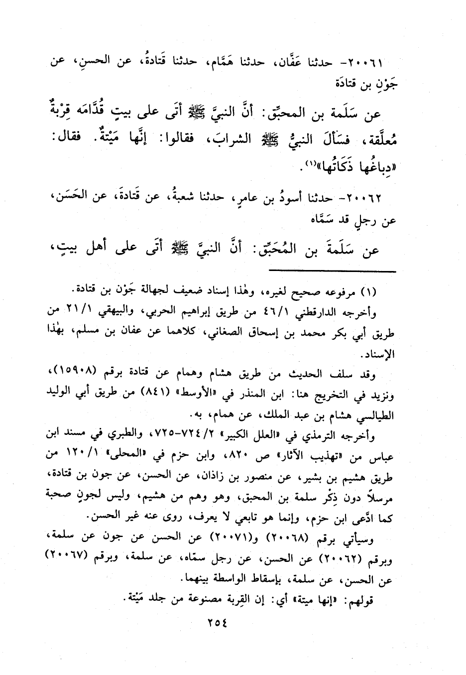 ٢٠٠٦١ - حَدَّثَنَا عَفَّانُ، حَدَّثَنَا هَمَّامٌ، حَدَّثَنَا قَتَادَةُ، عَنِ الْحَسَنِ، عَنْ جَوْنِ بْنِ قَتَادَةَ، عَنْ سَلَمَةَ بْنِ الْمُحَبِّقِ، أَنَّ النَّبِيَّ صَلَّى اللهُ عَلَيْهِ وَسَلَّمَ أَتَى عَلَى بَيْتٍ قُدَّامُهُ قِرْبَةٌ مُعَلَّقَةٌ، فَسَأَلَ النَّبِيُّ صَلَّى اللهُ عَلَيْهِ وَسَلَّمَ الشَّرَابَ؟ فَقَالُوا: إِنَّهَا مَيْتَةٌ، فَقَالَ: " دِبَاغُهَا ذَكَاتُهَا " (١)