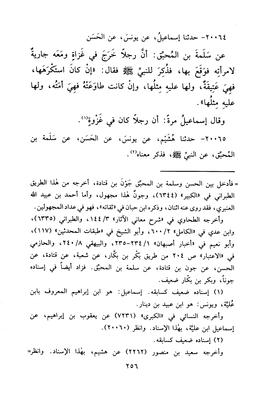 وأخرجه الطحاوي في "شرح معاني الآثار" ٣/١٤٤، والطبراني (٦٣٣٥) ، وابن عدي في "الكامل" ٢/٦٠٠، وأبو الشيخ في "طبقات المحدثين" (١١٧) ، وأبو نعيم في "أخبار أصبهان"١/٢٣٤-٢٣٥، والبيهقي ٨/٢٤٠، والحازمي في "الاعتبار" ص ٢٠٤ من طريق بكْر بن بكَار، عن شعبة، عن قتادة، عن الحسن، عن جون بن قتادة، عن سلمة بن المحبَّق. فزاد أيضاً في إسناده جوناً، وبكر بن بكار ضعيف.