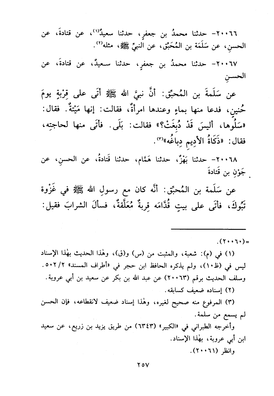٢٠٠٦٧ - حَدَّثَنَا مُحَمَّدُ بْنُ جَعْفَرٍ، حَدَّثَنَا سَعِيدٌ، عَنْ قَتَادَةَ، عَنِ الْحَسَنِ، عَنْ سَلَمَةَ بْنِ الْمُحَبِّقِ، أَنَّ نَبِيَّ اللهِ صَلَّى اللهُ عَلَيْهِ وَسَلَّمَ أَتَى عَلَى قِرْبَةٍ يَوْمَ حُنَيْنٍ، فَدَعَا مِنْهَا بِمَاءٍ وَعِنْدَهَا امْرَأَةٌ، فَقَالَتْ: إِنَّهَا مَيْتَةٌ، فَقَالَ: " سَلُوهَا أَلَيْسَ قَدْ دُبِغَتْ؟ " فَقَالَتْ: بَلَى، فَأَتَى مِنْهَا لِحَاجَتِهِ، فَقَالَ: " ذَكَاةُ الْأَدِيمِ دِبَاغُهُ " (٣)