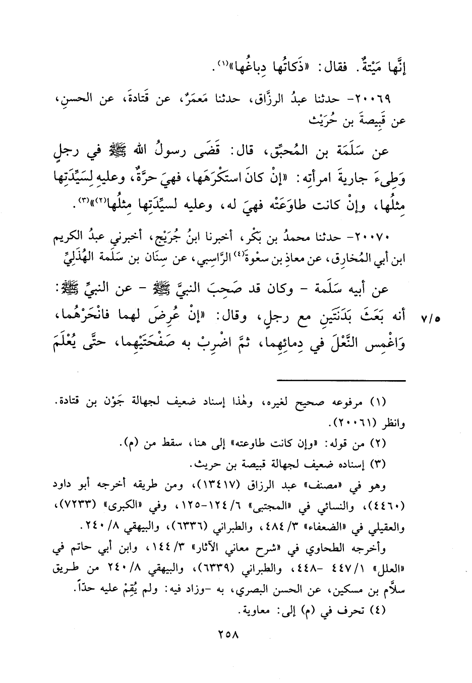 ٢٠٠٦٩ - حَدَّثَنَا عَبْدُ الرَّزَّاقِ، حَدَّثَنَا مَعْمَرٌ، عَنْ قَتَادَةَ، عَنِ الْحَسَنِ، عَنْ قَبِيصَةَ بْنِ حُرَيْثٍ، عَنْ سَلَمَةَ بْنِ الْمُحَبِّقِ، قَالَ: قَضَى رَسُولُ اللهِ صَلَّى اللهُ عَلَيْهِ وَسَلَّمَ فِي رَجُلٍ وَطِئَ جَارِيَةَ امْرَأَتِهِ: " إِنْ كَانَ اسْتَكْرَهَهَا، فَهِيَ حُرَّةٌ، وَعَلَيْهِ لِسَيِّدَتِهَا مِثْلُهَا (٢) " (٣)