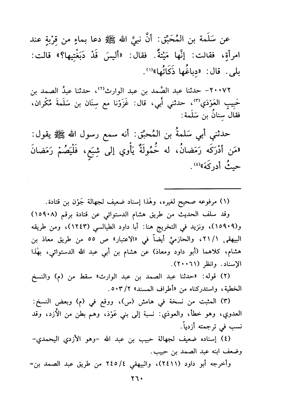 ٢٠٠٧٢ - حَدَّثَنَا عَبْدُ الصَّمَدِ بْنُ عَبْدِ الْوَارِثِ، (٢) حَدَّثَنَا عَبْدُ الصَّمَدِ بْنُ حَبِيبٍ الْعَوْذِيُّ، (٣) حَدَّثَنِي أَبِي، قَالَ: غَزَوْنَا مَعَ سِنَانِ بْنِ سَلَمَةَ مُكْرَانَ، فَقَالَ سِنَانُ بْنُ سَلَمَةَ: حَدَّثَنِي أَبِي سَلَمَةُ بْنُ الْمُحَبِّقِ، أَنَّهُ سَمِعَ رَسُولَ اللهِ صَلَّى اللهُ عَلَيْهِ وَسَلَّمَ يَقُولُ: " مَنْ أَدْرَكَهُ رَمَضَانُ لَهُ حُمُولَةٌ يَأْوِي إِلَى شِبَعٍ، فَلْيَصُمْ رَمَضَانَ حَيْثُ أَدْرَكَهُ " (٤)