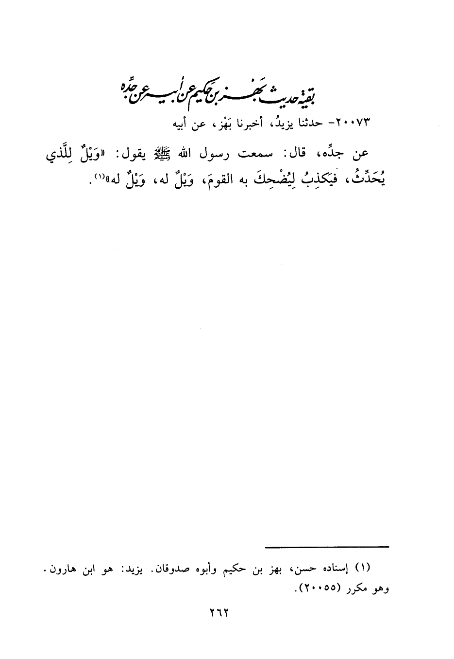 ٢٠٠٧٣ - حَدَّثَنَا يَزِيدُ، أَخْبَرَنَا بَهْزٌ، عَنْ أَبِيهِ، عَنْ جَدِّهِ، قَالَ: سَمِعْتُ رَسُولَ اللهِ صَلَّى اللهُ عَلَيْهِ وَسَلَّمَ يَقُولُ: " وَيْلٌ لِلَّذِي يُحَدِّثُ فَيَكْذِبُ لِيُضْحِكَ بِهِ الْقَوْمَ، وَيْلٌ لَهُ، وَيْلٌ لَهُ " (١)