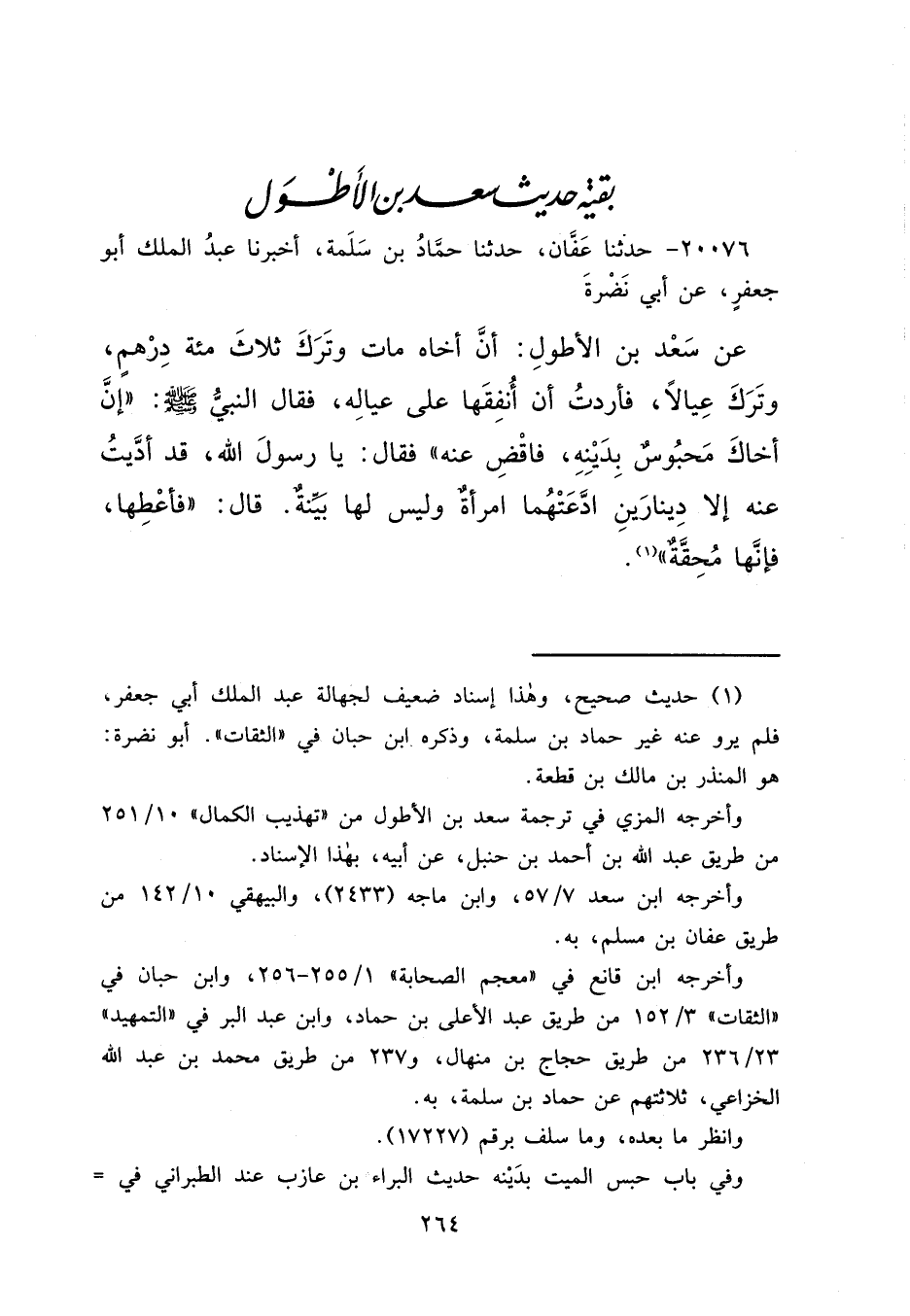 ٢٠٠٧٦ - حَدَّثَنَا عَفَّانُ، حَدَّثَنَا حَمَّادُ بْنُ سَلَمَةَ، أَخْبَرَنَا عَبْدُ الْمَلِكِ أَبُو جَعْفَرٍ، عَنْ أَبِي نَضْرَةَ، عَنْ سَعْدِ بْنِ الْأَطْوَلِ، أَنَّ أَخَاهُ مَاتَ، وَتَرْكَ ثَلَاثَ مِائَةِ دِرْهَمٍ، وَتَرَكَ عِيَالًا، فَأَرَدْتُ أَنْ أُنْفِقَهَا عَلَى عِيَالِهِ، فَقَالَ النَّبِيُّ صَلَّى اللهُ عَلَيْهِ وَسَلَّمَ: " إِنَّ أَخَاكَ مَحْبُوسٌ بِدَيْنِهِ، فَاقْضِ عَنْهُ "، فَقَالَ: يَا رَسُولَ اللهِ، فَقَدْ أَدَّيْتُ عَنْهُ إِلَّا دِينَارَيْنِ ادَّعَتْهُمَا امْرَأَةٌ، وَلَيْسَ لَهَا بَيِّنَةٌ، قَالَ: " فَأَعْطِهَا فَإِنَّهَا مُحِقَّةٌ "، (١)