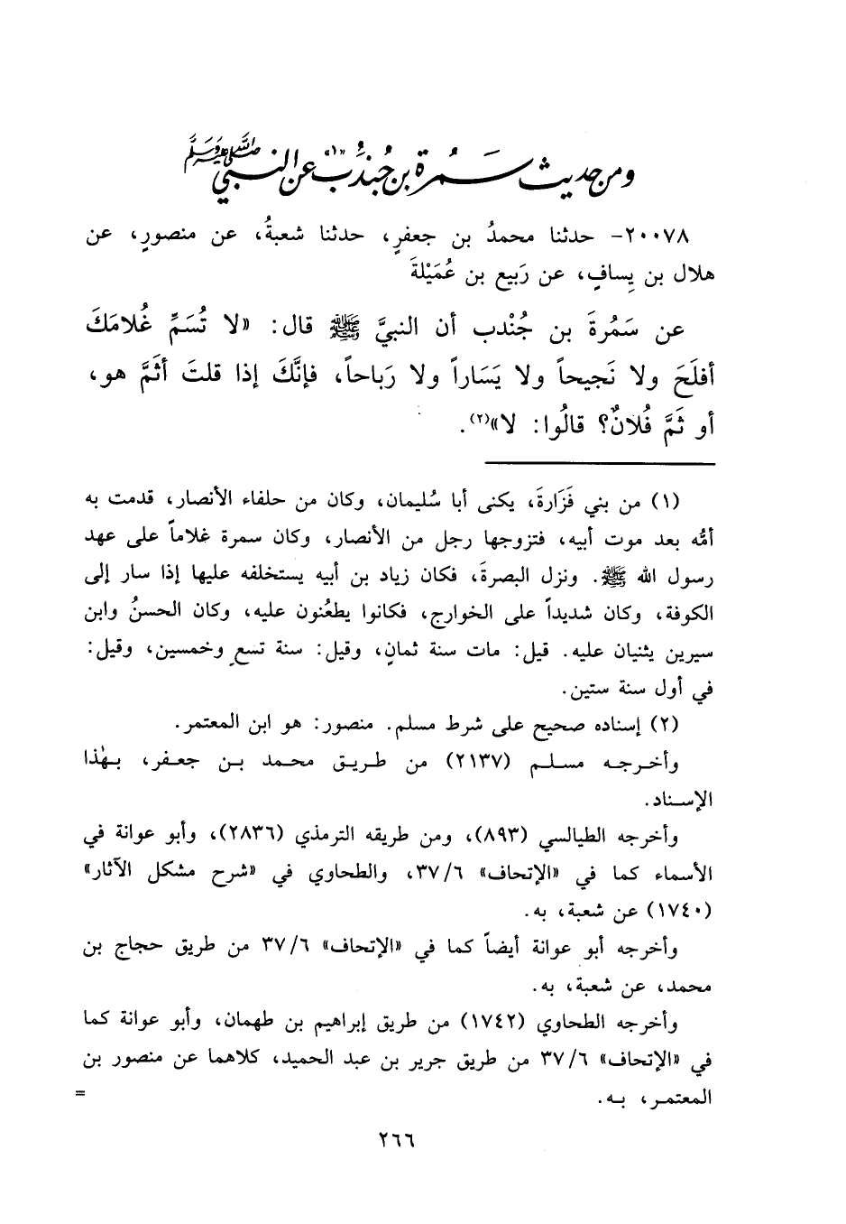 ٢٠٠٧٨ - حَدَّثَنَا مُحَمَّدُ بْنُ جَعْفَرٍ، حَدَّثَنَا شُعْبَةُ، عَنْ مَنْصُورٍ، عَنْ هِلَالِ بْنِ يَسَافٍ، عَنْ رَبِيعِ بْنِ عَمِيلَةَ، عَنْ سَمُرَةَ بْنِ جُنْدُبٍ، أَنَّ النَّبِيَّ صَلَّى اللهُ عَلَيْهِ وَسَلَّمَ قَالَ: " لَا تُسَمِّ غُلَامَكَ أَفْلَحَ، وَلَا نَجِيحًا، وَلَا يَسَارًا، وَلَا رَبَاحًا، فَإِنَّكَ إِذَا قُلْتَ: أَثَمَّ هُوَ، أَوْ ثَمَّ فُلَانٌ؟ قَالُوا: لَا " (٢)