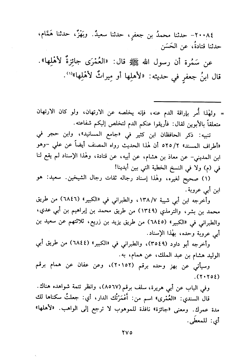 ٢٠٠٨٤ - حَدَّثَنَا مُحَمَّدُ بْنُ جَعْفَرٍ، حَدَّثَنَا سَعِيدٌ، وَبَهْزٌ، حَدَّثَنَا هَمَّامٌ، حَدَّثَنَا قَتَادَةُ، عَنِ الْحَسَنِ، عَنْ سَمُرَةَ، أَنَّ رَسُولَ اللهِ صَلَّى اللهُ عَلَيْهِ وَسَلَّمَ قَالَ: " الْعُمْرَى جَائِزَةٌ لِأَهْلِهَا "، قَالَ ابْنُ جَعْفَرٍ فِي حَدِيثِهِ: " لِأَهْلِهَا أَوْ مِيرَاثٌ لِأَهْلِهَا " (١)