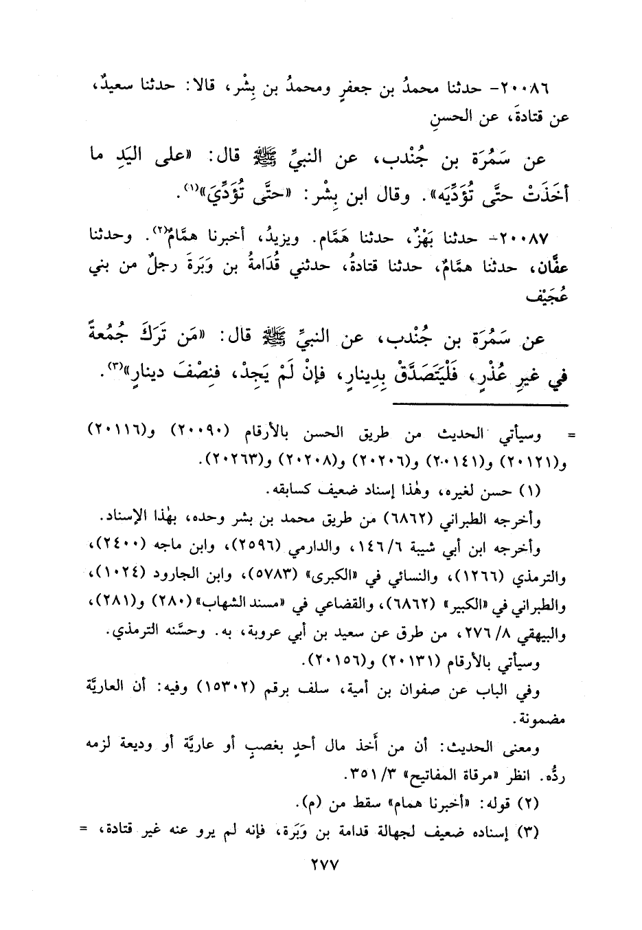 ٢٠٠٨٦ - حَدَّثَنَا مُحَمَّدُ بْنُ جَعْفَرٍ، وَمُحَمَّدُ بْنُ بِشْرٍ، قَالَا: حَدَّثَنَا سَعِيدٌ، عَنْ قَتَادَةَ، عَنِ الْحَسَنِ، عَنْ سَمُرَةَ بْنِ جُنْدُبٍ، عَنِ النَّبِيِّ صَلَّى اللهُ عَلَيْهِ وَسَلَّمَ قَالَ: " عَلَى الْيَدِ مَا أَخَذَتْ حَتَّى تُؤَدِّيَهُ "، وَقَالَ ابْنُ بِشْرٍ: " حَتَّى تُؤَدِّيَ " (١)