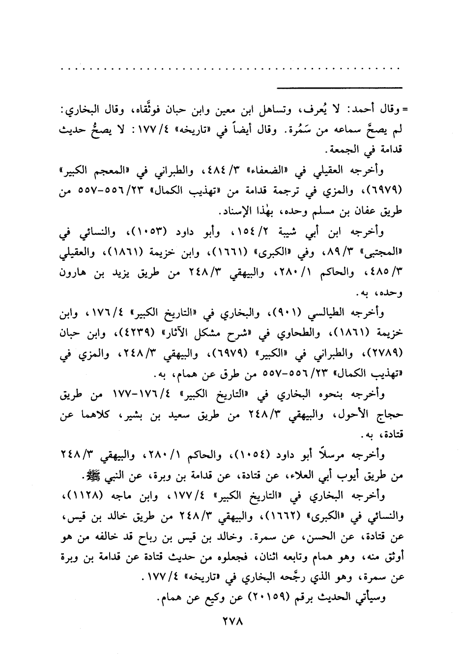 = وقال أحمد: لا يُعرف، وتساهل ابن معين وابن حبان فوثقاه، وقال البخاري: لم يصحَّ سماعه من سَمُرة. وقال أيضاً في "تاريخه" ٤/١٧٧: لا يصحُ حديث قدامة في الجمعة.