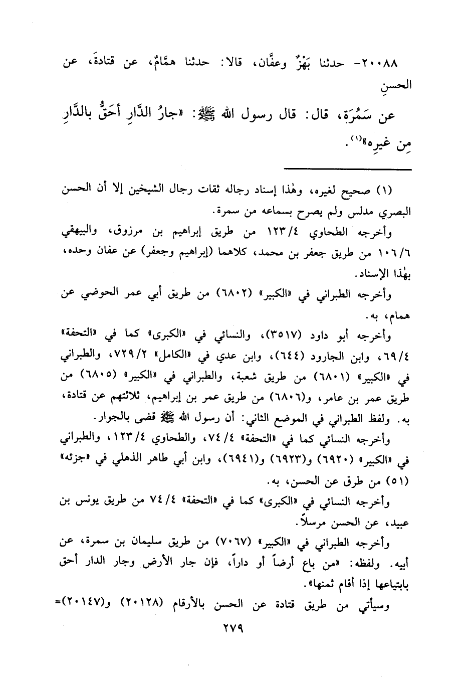 ٢٠٠٨٨ - حَدَّثَنَا بَهْزٌ، وَعَفَّانُ، قَالَا: حَدَّثَنَا هَمَّامٌ، عَنْ قَتَادَةَ، عَنِ الْحَسَنِ، عَنْ سَمُرَةَ، قَالَ: قَالَ رَسُولُ اللهِ صَلَّى اللهُ عَلَيْهِ وَسَلَّمَ: " جَارُ الدَّارِ أَحَقُّ بِالدَّارِ مِنْ غَيْرِهِ " (١)