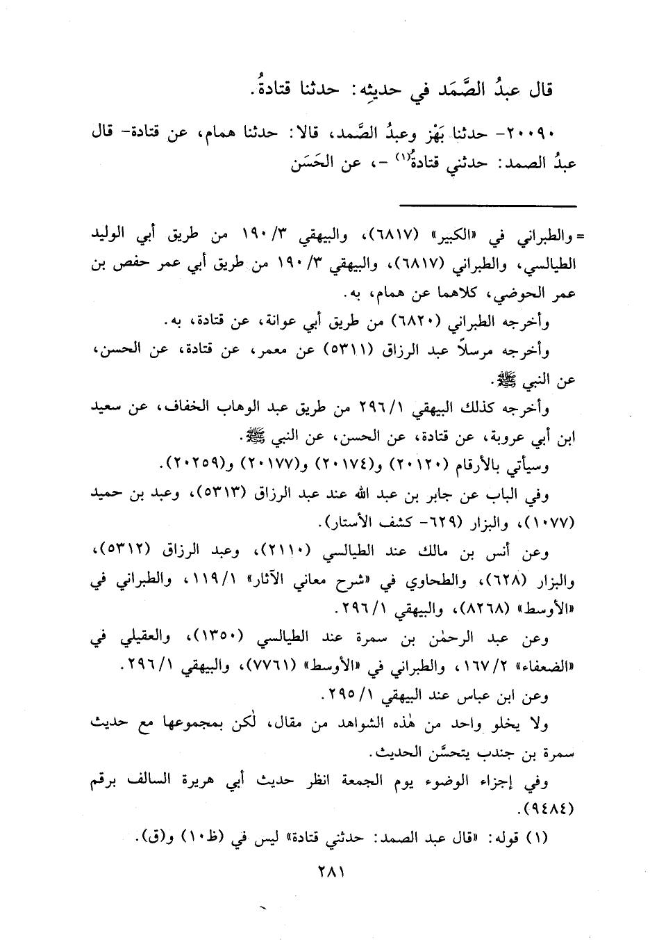 ٢٠٠٩٠ - حَدَّثَنَا بَهْزٌ، وَعَبْدُ الصَّمَدِ، قَالَا: حَدَّثَنَا هَمَّامٌ، عَنْ قَتَادَةَ، قَالَ عَبْدُ الصَّمَدِ: حَدَّثَنِي قَتَادَةُ، (١) عَنِ الْحَسَنِ،