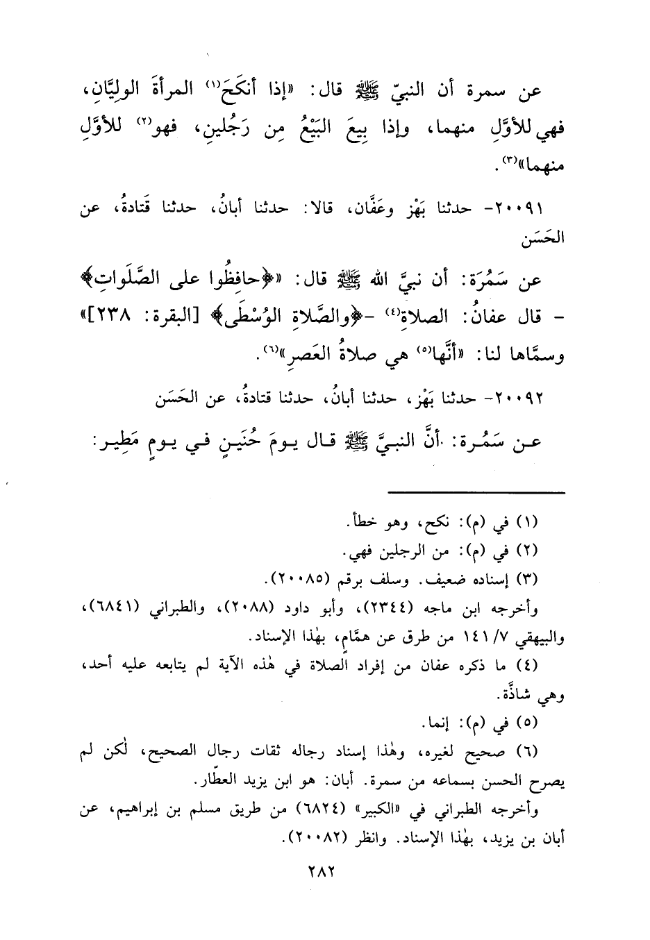 ٢٠٠٩١ - حَدَّثَنَا بَهْزٌ، وَعَفَّانُ، قَالَا: حَدَّثَنَا أَبَانُ، حَدَّثَنَا قَتَادَةُ، عَنِ الْحَسَنِ، عَنْ سَمُرَةَ، أَنَّ نَبِيَّ اللهِ صَلَّى اللهُ عَلَيْهِ وَسَلَّمَ قَالَ: {حَافِظُوا عَلَى الصَّلَوَاتِ} [البقرة: ٢٣٨] ، قَالَ عَفَّانُ: الصَّلَاةِ، (٤) {وَالصَّلَاةِ الْوُسْطَى} [البقرة: ٢٣٨] ، وَسَمَّاهَا لَنَا: " أَنَّهَا (٥) هِيَ صَلَاةُ الْعَصْرِ " (٦)