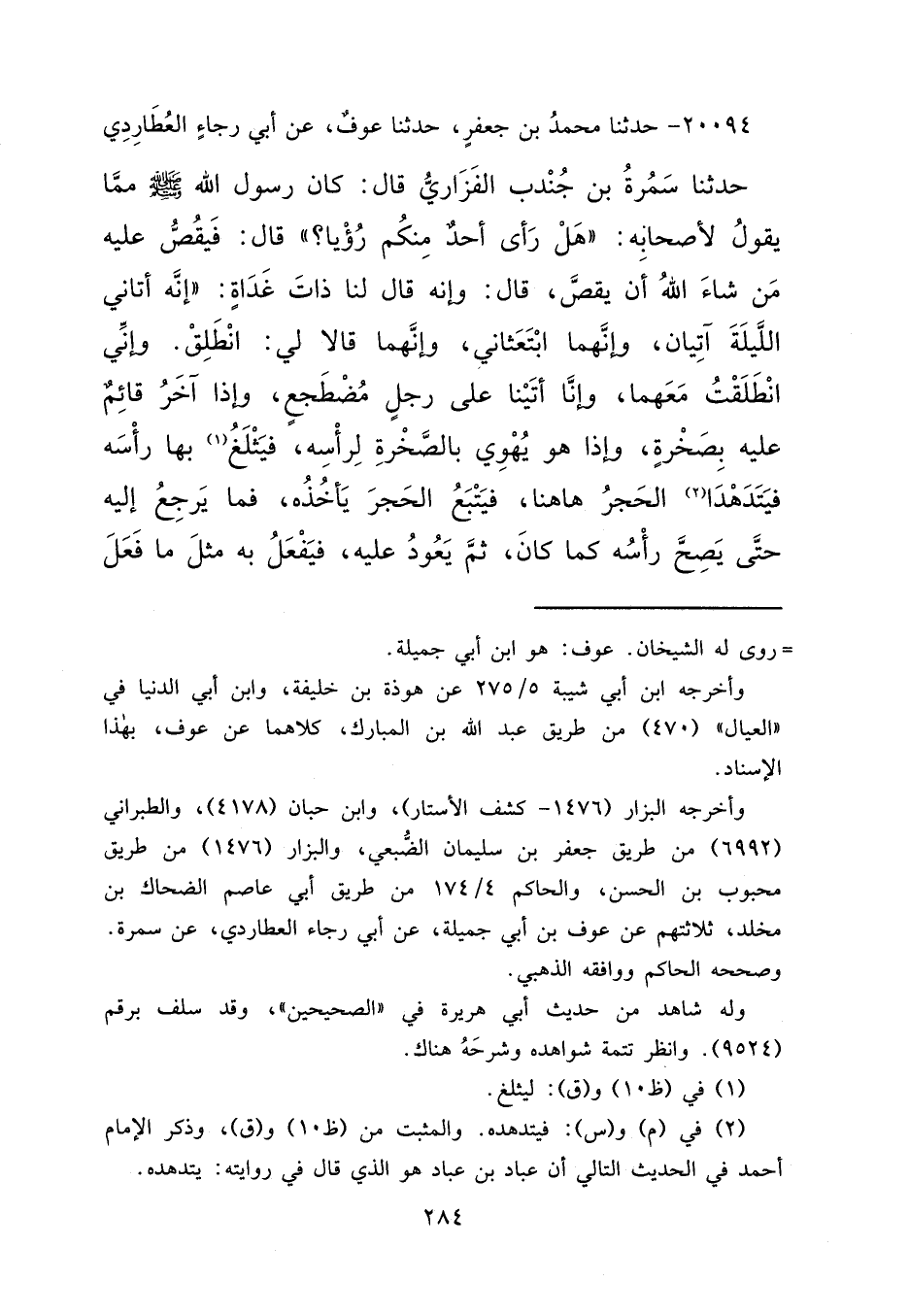 ٢٠٠٩٤ - حَدَّثَنَا مُحَمَّدُ بْنُ جَعْفَرٍ، حَدَّثَنَا عَوْفٌ، عَنْ أَبِي رَجَاءٍ الْعُطَارِدِيِّ، حَدَّثَنَا سَمُرَةُ بْنُ جُنْدُبٍ الْفَزَارِيُّ، قَالَ: كَانَ رَسُولُ اللهِ صَلَّى اللهُ عَلَيْهِ وَسَلَّمَ مِمَّا يَقُولُ لِأَصْحَابِهِ: " هَلْ رَأَى أَحَدٌ مِنْكُمْ رُؤْيَا؟ " قَالَ: فَيَقُصُّ عَلَيْهِ مَنْ شَاءَ اللهُ أَنْ يَقُصَّ، قَالَ: وَإِنَّهُ قَالَ لَنَا ذَاتَ غَدَاةٍ: " إِنَّهُ أَتَانِي اللَّيْلَةَ آتِيَانِ، وَإِنَّهُمَا ابْتَعَثَانِي، وَإِنَّهُمَا قَالَا لِي: انْطَلِقْ، وَإِنِّي انْطَلَقْتُ مَعَهُمَا، وَإِنَّا أَتَيْنَا عَلَى رَجُلٍ مُضْطَجِعٍ، وَإِذَا آخَرُ قَائِمٌ عَلَيْهِ بِصَخْرَةٍ، وَإِذَا هُوَ يَهْوِي عَلَيْهِ بِالصَّخْرَةِ لِرَأْسِهِ، فَيَثْلَغُ (١) بِهَا رَأْسَهُ، فَيَتَدَهْدَا (٢) الْحَجَرُ هَاهُنَا، فَيَتْبَعُ الْحَجَرَ يَأْخُذُهُ، فَمَا يَرْجِعُ إِلَيْهِ حَتَّى يَصِحَّ رَأْسُهُ كَمَا كَانَ، ثُمَّ يَعُودُ عَلَيْهِ، فَيَفْعَلُ بِهِ مِثْلَ مَا فَعَلَ
